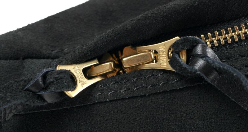 BELTとBAGとの繋ぎ目はリベットで補強。また全体の雰囲気を損なわないようにギャランティータグを使用しました。ZIPPERはUNIVERSAL ZIPPERを使用しグローブ装着時でも開け閉めしやすいようにレザーのプルタグ付。メインポケットはW ZIPPERタイプになっています。