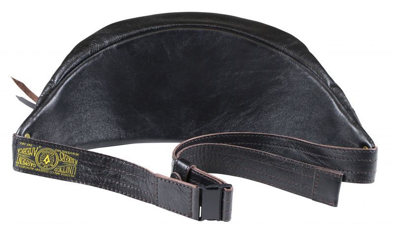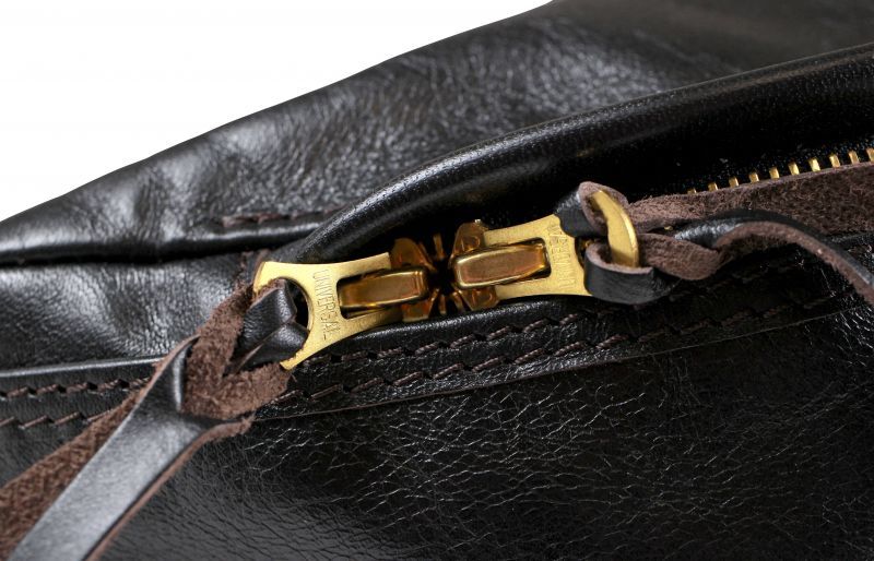 BELTとBAGとの繋ぎ目はリベットで補強。また全体の雰囲気を損なわないようにギャランティータグを使用しました。ZIPPERはUNIVERSAL ZIPPERを使用しグローブ装着時でも開け閉めしやすいようにレザーのプルタグ付。メインポケットはW ZIPPERタイプになっています。