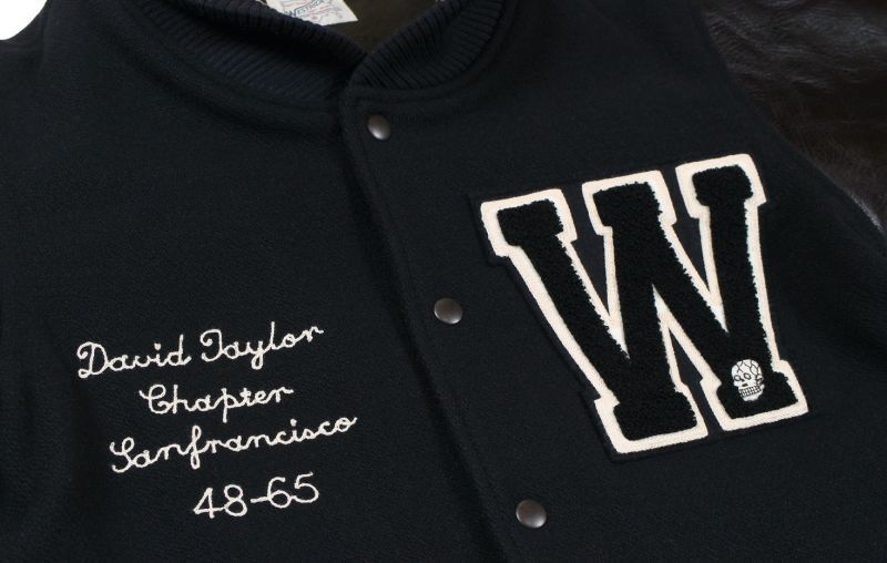 背面のシンプルで力強い刺繍が強い印象を残すハーフタイプのアワードジャケット。本来、「卒業時」の記念品として贈呈されるこのジャケットは、WRが設定する架空の団体である「全米楽しむ協会」によるもの。これは「皆が楽しむこと。一人でも多くの人が楽しむこと」を目的に活動する啓蒙団体。この団体に48‐65年の間、在籍して活動したDAVID氏が引退の際に捧げられたもの、というストーリー。表地W90N10の2重織ウールメルトンは羊の油分を取り除き、ヴィンテージさながらの表情を再現。スリーブにはRIDING WAIST BAGでお馴染みのベジタブルタンニングのオリジナル茶芯ホースハイドを贅沢に使用しています。裏地には綿100%でありながら、光沢のある長い毛足と高級感が特徴のカシミアビーバー風に特殊加工した耳付きオリジナルネル。サガラ刺繍のワッペン・前後のチェーン刺繍は、新潟職人の手作業で仕上げられた新作は完売必至の人気品番。