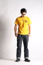 生地はORIGINAL HEAVY WEIGHT No.14 COTTON 100%。WESTRIDEのオリジナルTEEは、丸胴の吊り機で編み立てる→サイドを割ってダブルシームで縫製→内側サイドの縫い代をカット→ネックはトリプルバインダー。と非常に手間のかかる仕上げとなっている。この工程により、丸胴に見られるヨジレなどの型崩れもなく、肌触りも良好となる。製品として安定した品質を実現している。肌着としての側面も持つTEEだけに、プリント柄だけでなく、品質そのものに拘って生産しています。プリント手法に関しては、同一デザインであっても、ベースカラーやプリントカラー、プリントデザインを一つ一つ勘案し、各々ベストなものをチョイスし手刷りで行っている。(水性染込み、半ラバー、抜染、ひび割れなど)。
