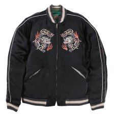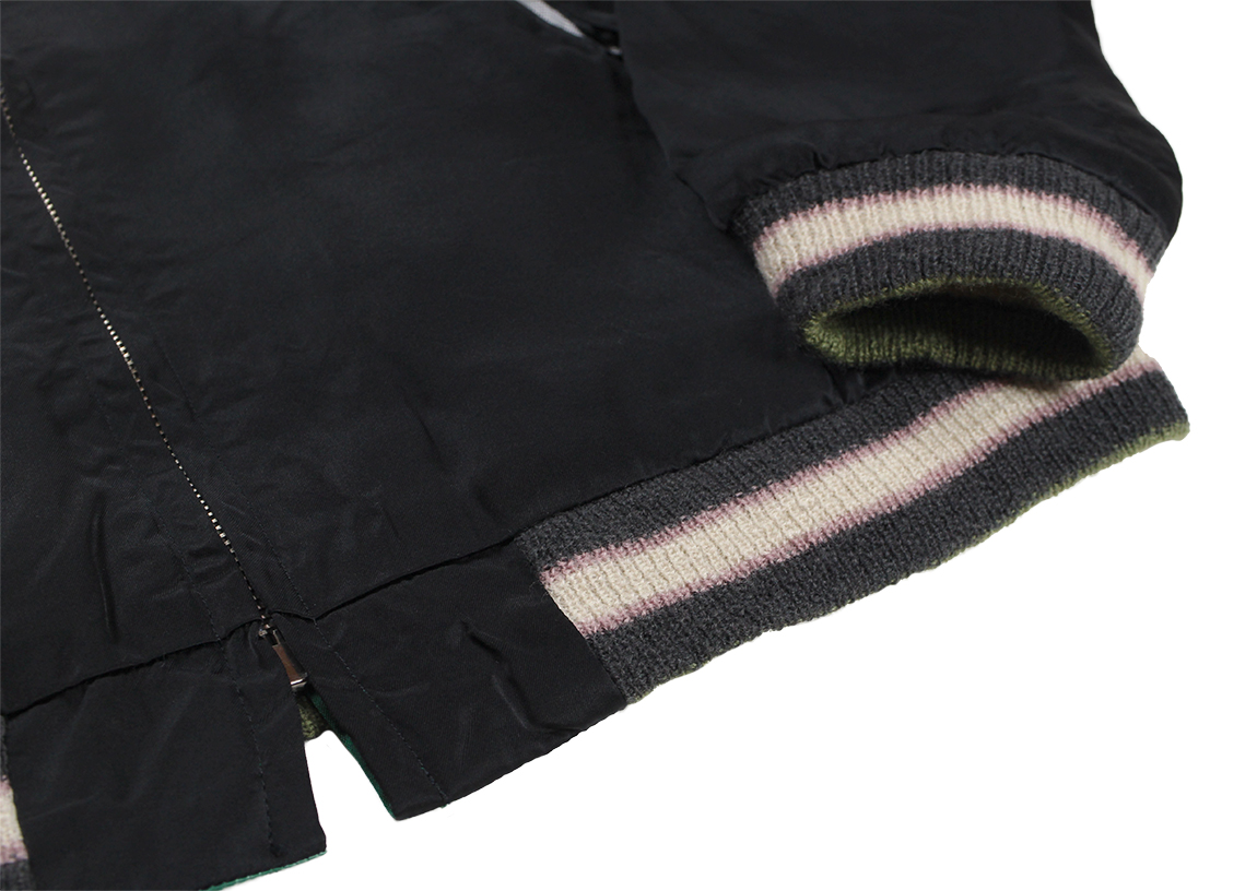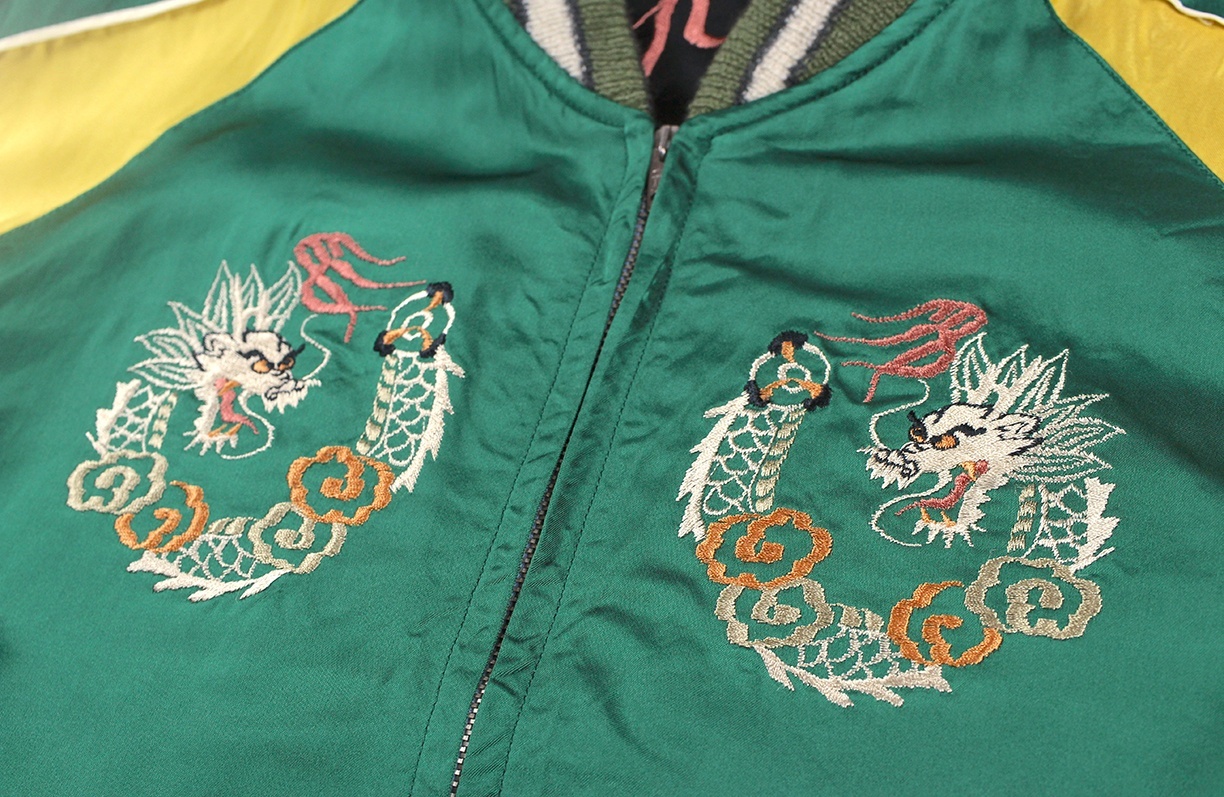 リバーシブル面は絡み合いながら天に昇る双龍の絵柄。2匹の龍が交差する複雑な図案だが、箇所ごとに針足と色糸を使い分けて見事に描写している。モノトーンを基調とした表面に対し、こちらはグリーン×ゴールドのボディでスカジャン王道の配色。ヴィンテージに準じたくすんだグリーンのリブが更に古めかしさを演出している。