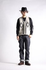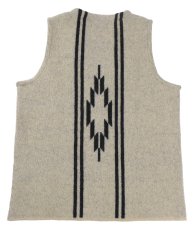 アメリカン・クロージングのアイコンの一つであり、LONG RIDERのイメージを色濃く反映する新作ベスト。贅沢なシェットランドウールを熱処理による強縮絨加工で仕上げ、旧いチマヨ織さながらの表情をウエストライドならではの新潟ニットで表現する独創的な力作です。柄文様にはNATIVE柄の代表作RIO GRANDEを採用。コンチョボタンはCHOOKE小野寺氏に製作依頼したオリジナル。シルバーの原形を基にニッケルを燻してビンテージのように仕上げたこのモデルの為に新たに製作した物となります。各部にはオリジナル同様レーヨンの当てを装備。コーディネイトとレイヤードが楽しみなベストは良質な素材を丁寧な縫製で仕上げる新潟産の逸品です。