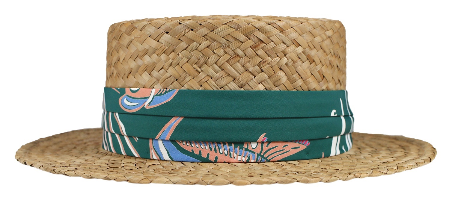 水の都、ヴェネツィアにはたくさんの水路が整備され、今でも多くのゴンドラが行き交っている。それぞれのゴンドラで華麗に船を操っていた船頭たちに愛用されていたのが、このボーターハットと呼ばれる所以。1940年代頃までは様々なハットの素材として使用されていたガマ草を使い、丁寧に編み込まれた帽体が使われている。ハットの王道とも言うべきディテールのリボンは、サイドに結び目がくるSUNSURFのレーヨン生地を使用した38mmのスタンダードな仕様。