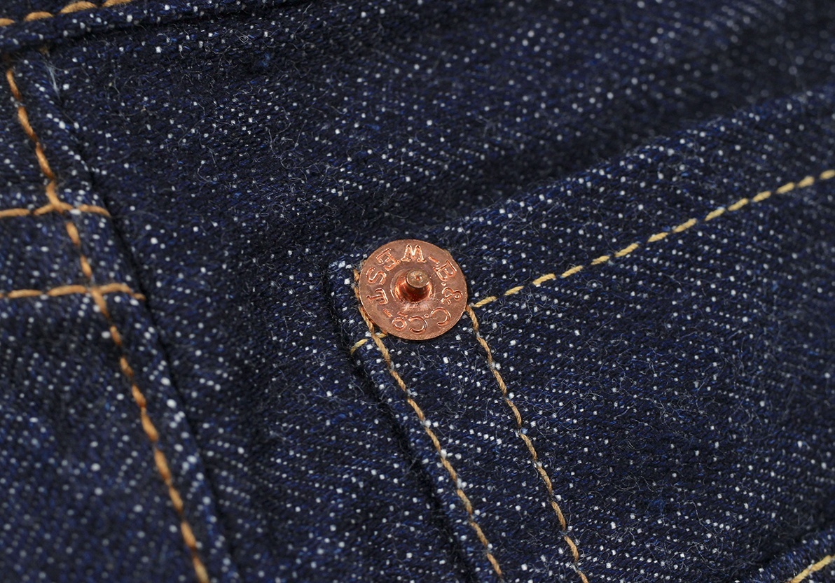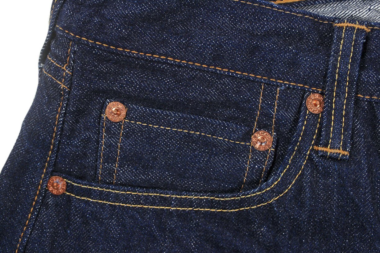 リベットは刻印入りの打ち抜きリベット、バックポケットにはフラット形状の隠しリベットを使用、