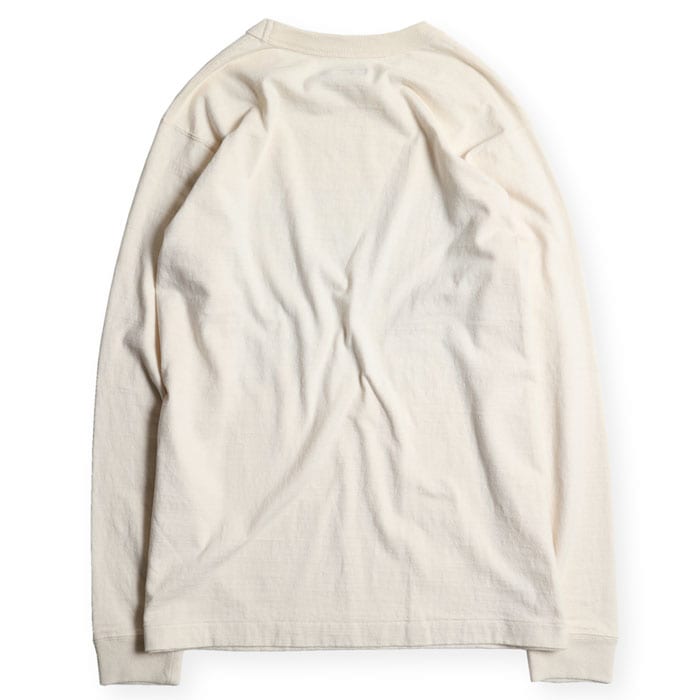 大人気アイテムとなった丸胴シリーズから待望の新作プリントLONG TEEがリリース。原点回帰でもある「古着」の表情をよりストレート且つ豊かに盛り込んで製作する一枚は16番単糸を吊り編み機でゆっくりと編み上げた丸胴仕上げ。旧い紡績技術により太い糸と細い糸が交ざり合うことで生まれる横段はこのシリーズならでは。身丈裾の縫製仕様に当時と同じ「天地縫い」を採用してシングルステッチ仕様に。ネック部のトリプルのバインディング仕上げやショルダーステッチなどの型崩れ防止が必要となる部位には従来通りの強度ある縫製法を使い分けて採用するという、拘りを満載した極上の一枚です。若干の斜行が特徴的なボディーは柔らかな着用感で気持ちゆったりとした着心地を提供。当時のVINTAGE TEEがそうであるように、プリントは敢えて前面のみとしています。袖リブも程好く短めに仕上げました。