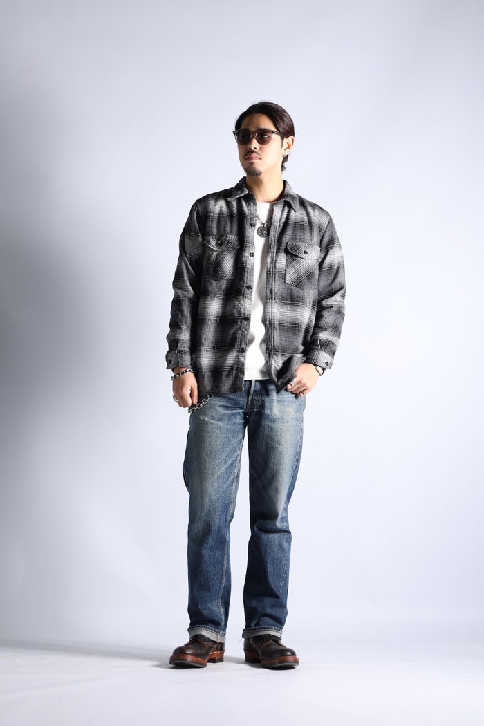 往年のワークウエアを想起させるヘビーウェイトネルを使用した一着は「ヒルビリー=田舎者」の呼称に相応しい新作。ヴィンテージ特有のサイドマチに加え、ポケットフラップ裏・台襟裏・カフス裏には綿麻シャンブレーによって補強、背中パネルは一枚仕様といったディテールは勿論、各部縫製などをオールドスタイルのディテールで仕上げています。