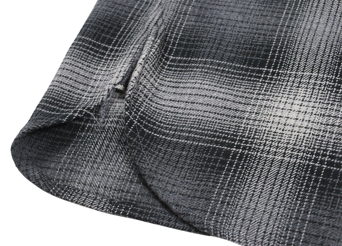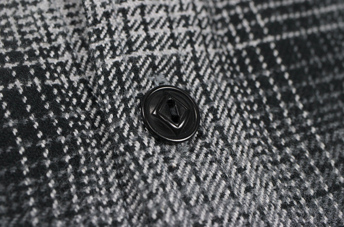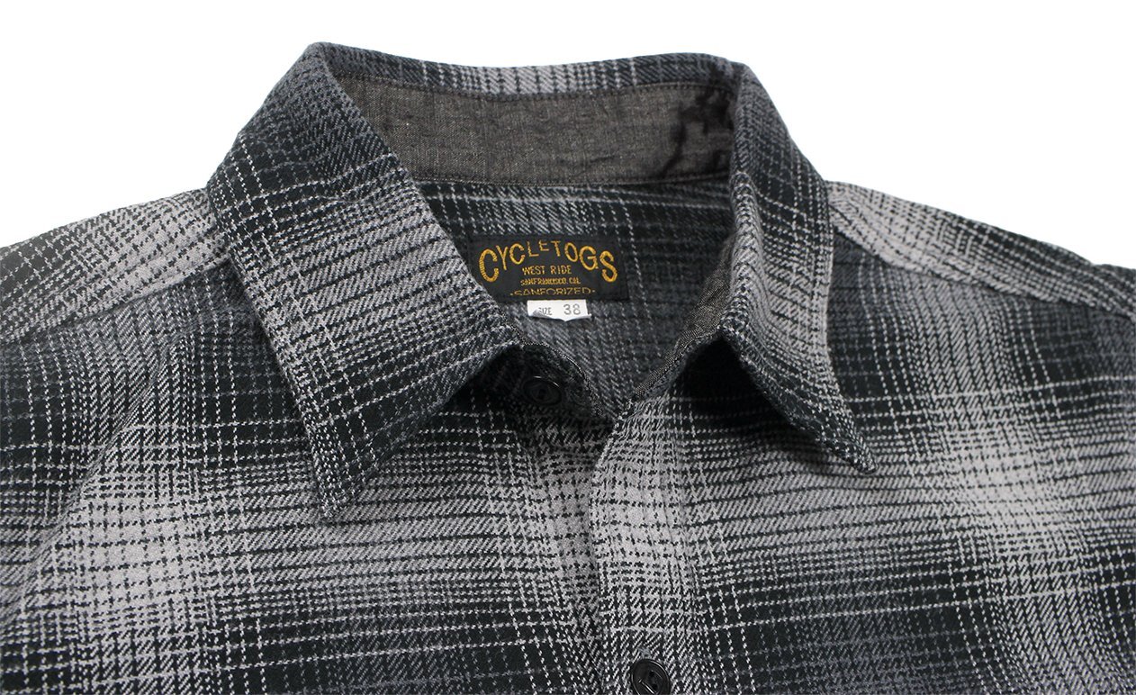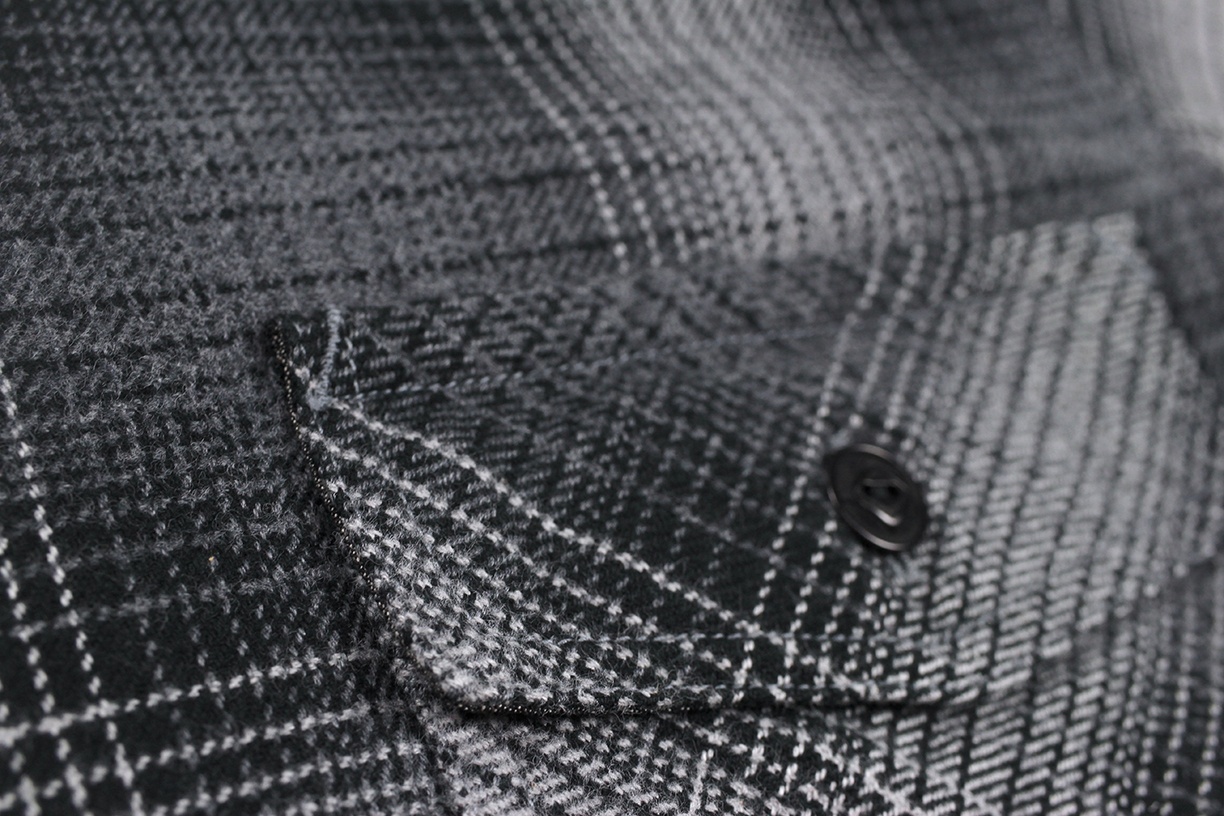 BLACK CHECK: COTTON100% 経糸緯糸に20番双糸と20番TOP双糸を用いたオンブレチェック柄。TOP糸を組み込むことで綿100%でありながらもウール感が生まれ、更に起毛を施すことでより上質な表情を見せる。黒を強調したミディアムウェイトネル。