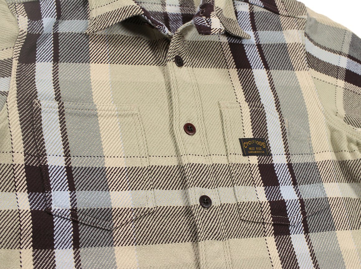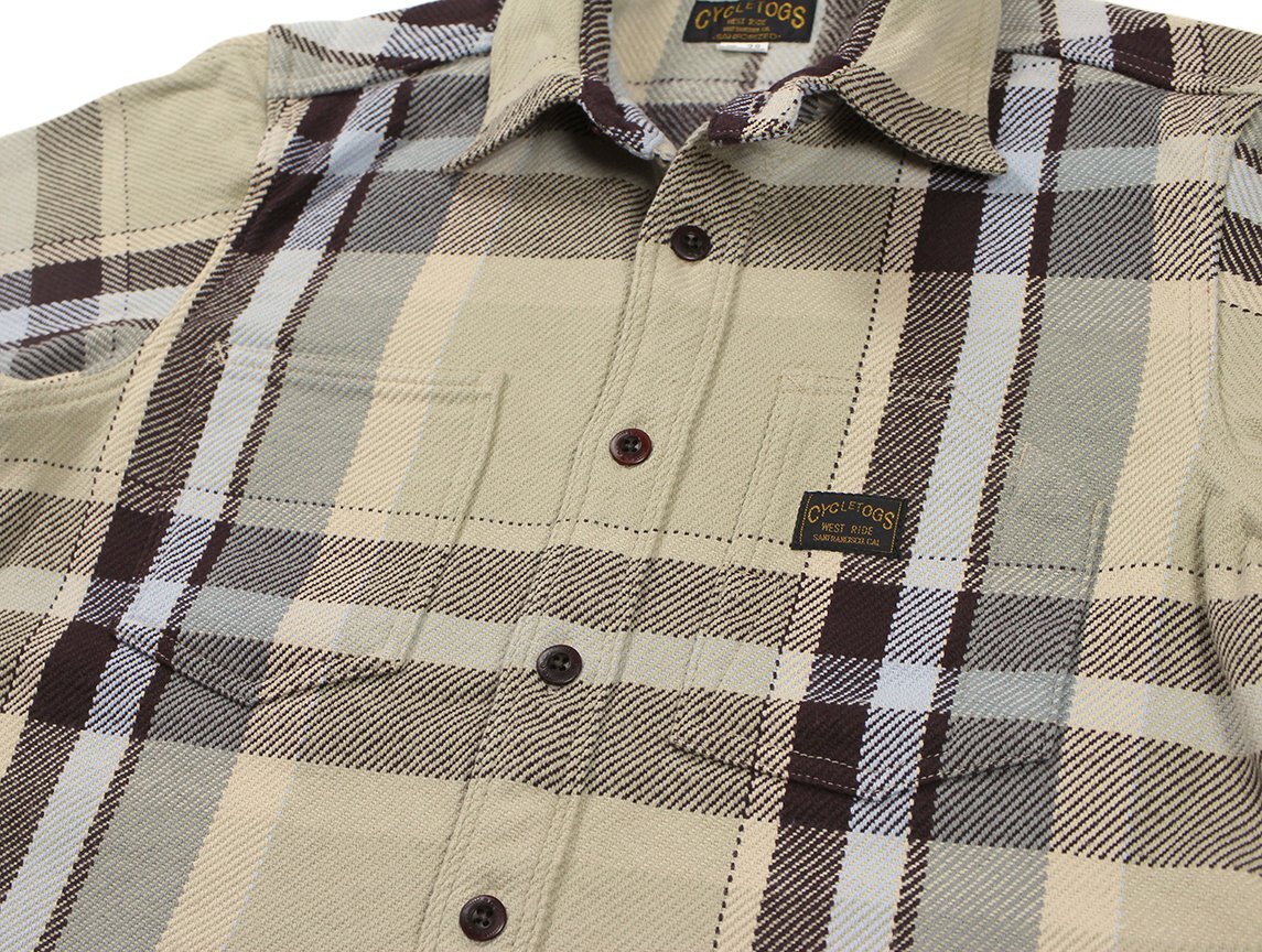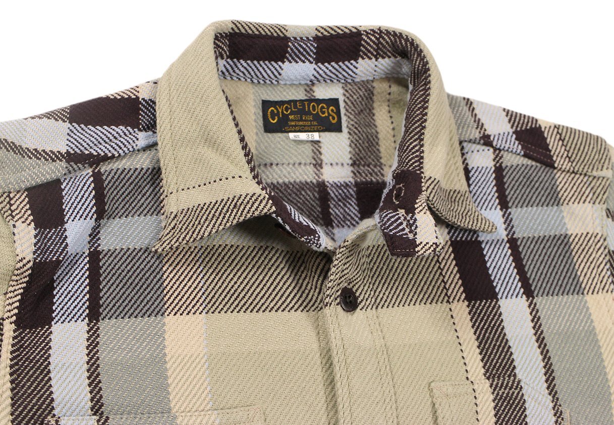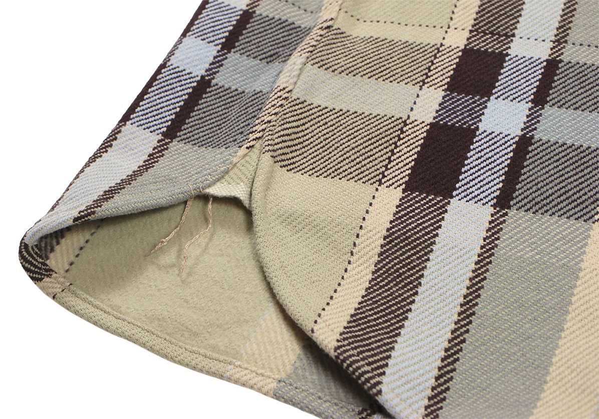 BROWN CHECK: COTTON100% 経糸10番引き揃い双糸・緯糸8番引き揃い単糸を用いて、柄ピッチ約23cm間隔で構成されたビッグプレードチェック。限界色数4色を用いて、新潟産地特有の右綾の綾目が強調されたヘビーウェイトネル。表面起毛、裏面深起毛。