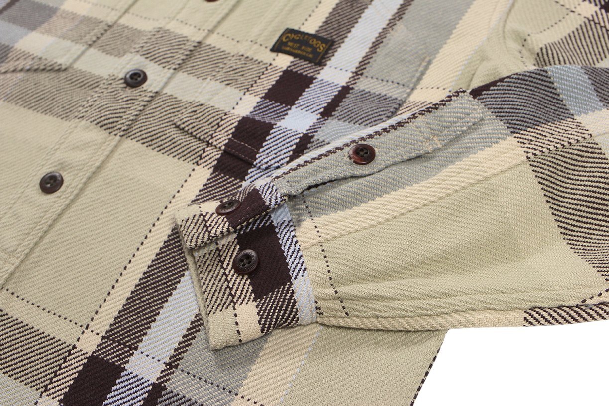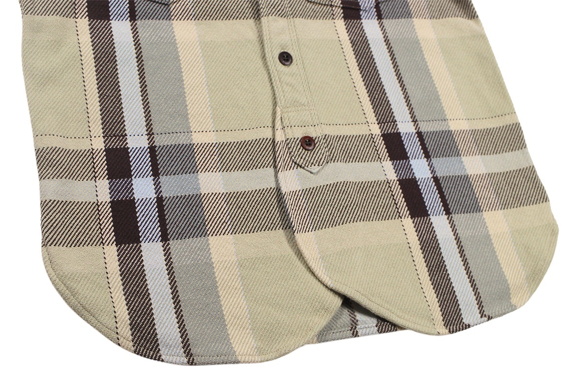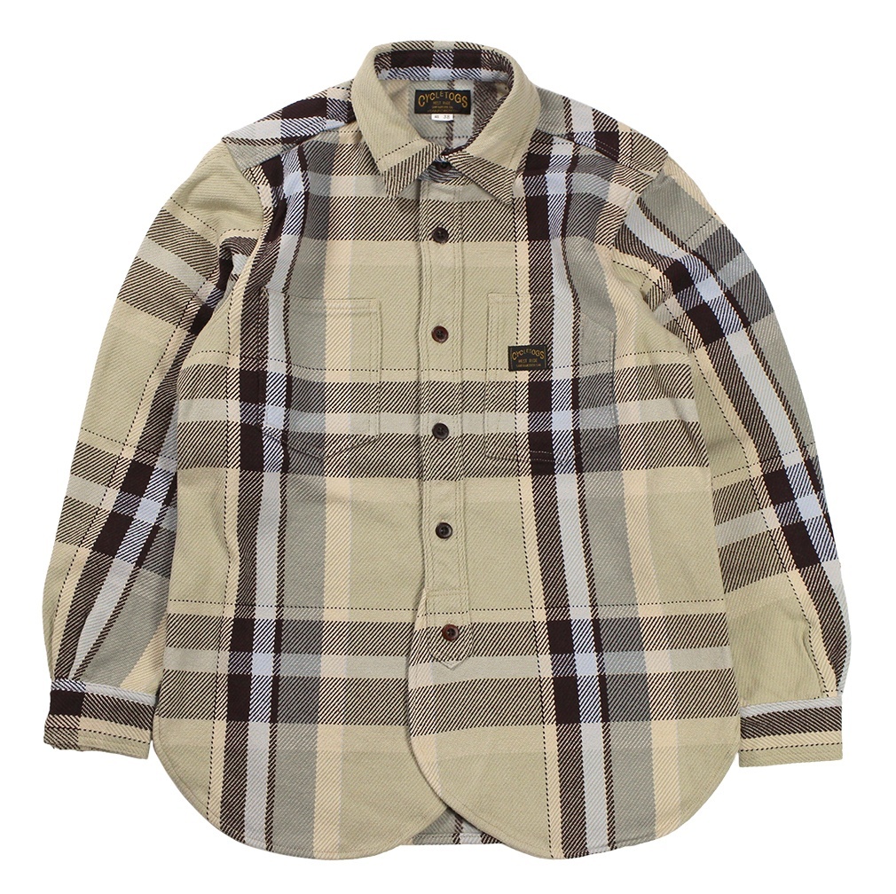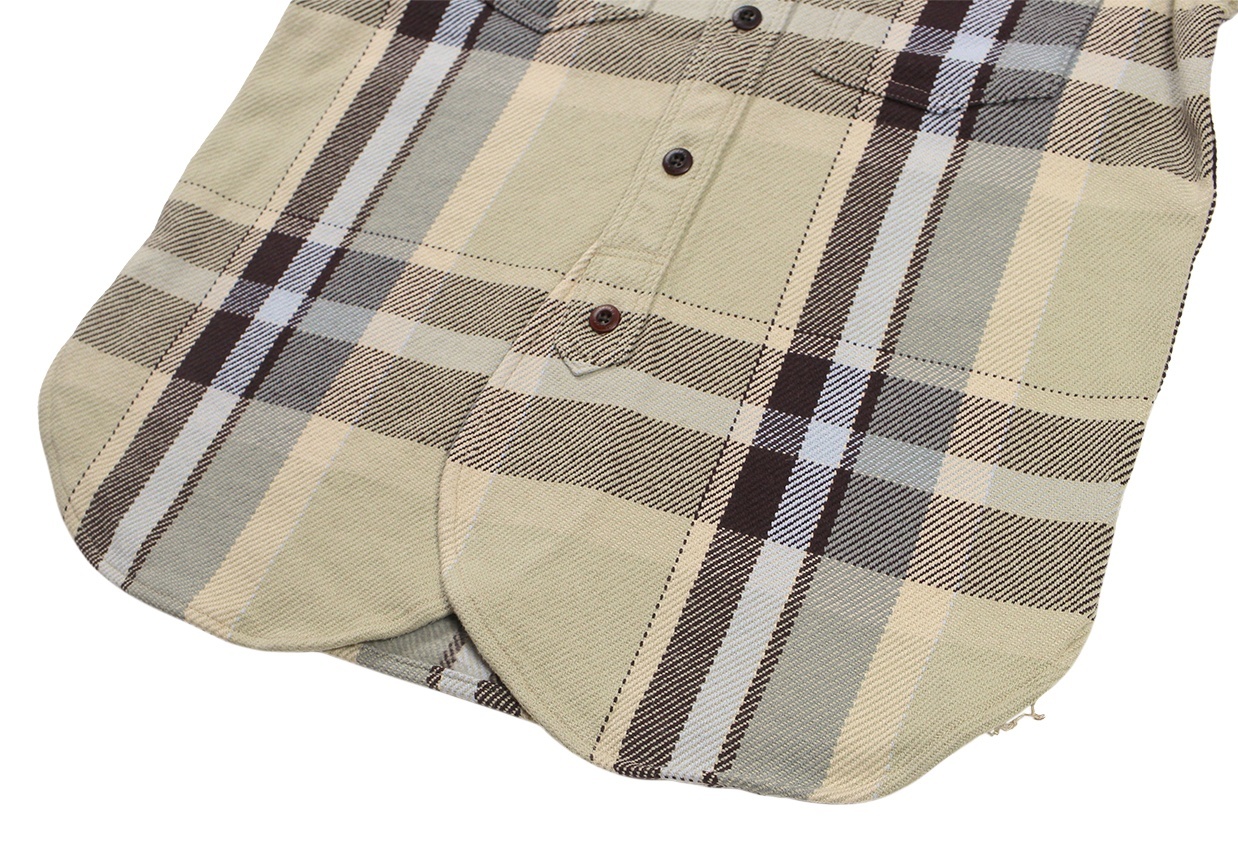 BROWN CHECK: COTTON100% 経糸10番引き揃い双糸・緯糸8番引き揃い単糸を用いて、柄ピッチ約23cm間隔で構成されたビッグプレードチェック。限界色数4色を用いて、新潟産地特有の右綾の綾目が強調されたヘビーウェイトネル。表面起毛、裏面深起毛。