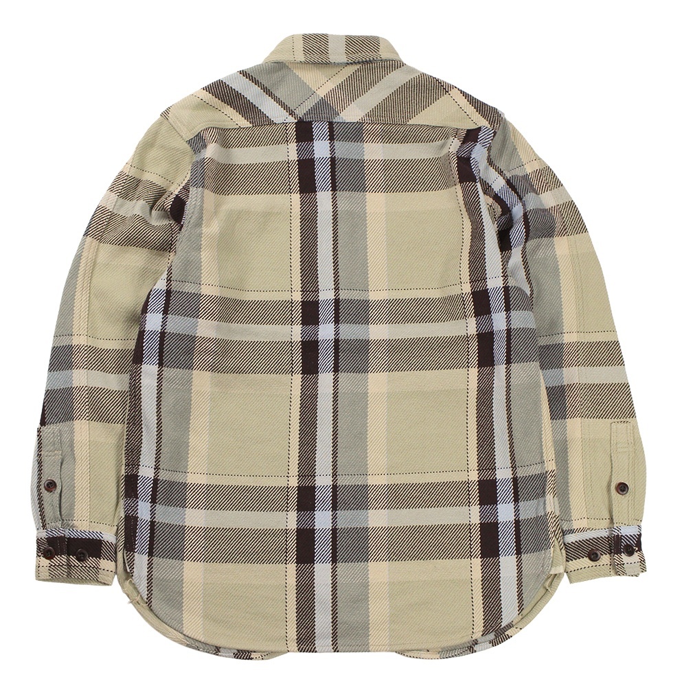 程好い着丈と袖丈で非常に高い人気と実績を持つPCHシャツ。袖口タック仕様に手首〜肘にかけて若干広くパターンを変更したリニューアル・バージョン。今季は、ヘビーウェイトの2柄で提案。2色共にヘビーウェイトでありながら糸を引き揃える事で生まれる柔らかな風合いが特徴。今季のモデルもシンプルで力強い佇まいを見せる。縫製仕様は巻縫いとなり、3つのパネルで構成される往年のスリーブ形状など、手の込んだディテールも健在。往年のアメリカン・ネルの力強さが際立つ一枚。ナット釦使用。