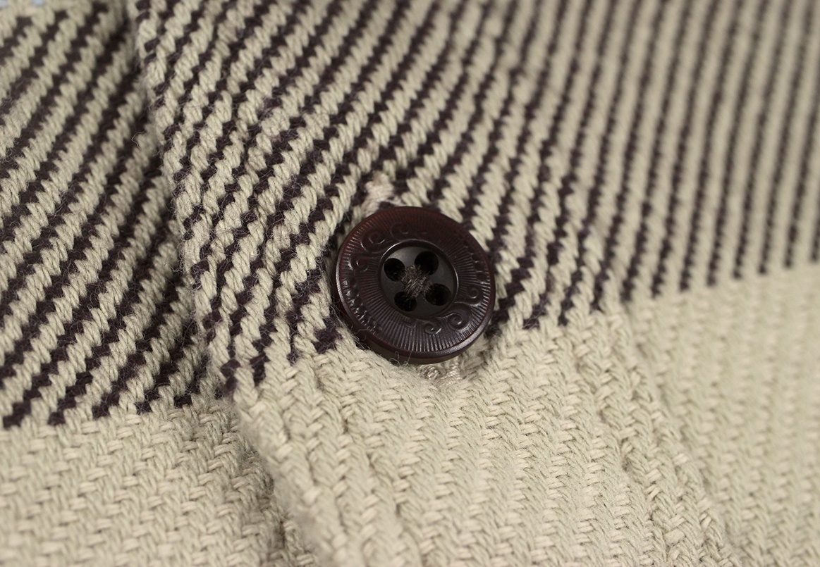 県内の機屋にて力織機を使用し、手間と時間を掛けて織り上げたオリジナル生地は1日に25mしか織れないオリジナルの耳付き新潟県産ネルとなります。当然のことながら作業効率は高速レピア織機に及ぶべくもないが、力織機ならではの柔らかなテンションでゆっくりと織り上げた生地には独特のデコボコ感があり、肌との間に空気の層ができるため、その空気を体温で温めつつ、素晴らしい着用感を実現する。その風合いと着心地は、現在の主流となるレピア高速織機では絶対に再現不可能。他の追随を許さないオリジナル生地を織り上げている。今後どれだけの期間、現在同様に生地の生産を続けていけるのかを危惧する程に希少価値の高い生地と言えるでしょう。