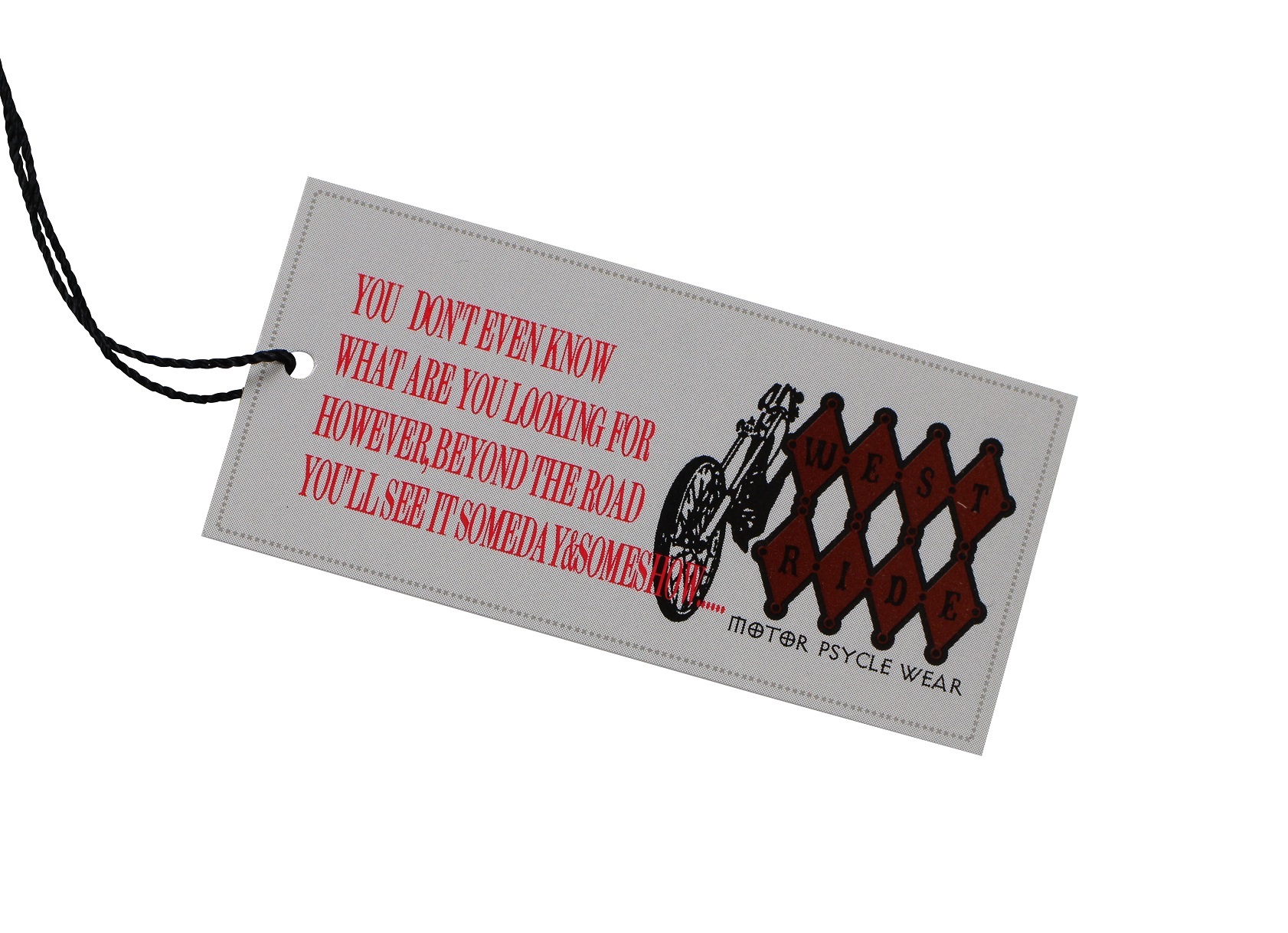 プリントデザイン:全グラフィックに各々のメッセージやストーリーが設定されている。デザインを身に着けると同時に、それらの背景に目を向けてみるのも楽しみの一つになっている。デザインはフロントプリントがメインになる物とバックプリントがメインになる物で、ウエストライドらしいアートワークでまとめ上げています。フロントデザインがメインとなるものはベストやシャツ&ジャケット等とのレイヤード、バックデザインがメインとなるものにはトップアクセサリーとのセットアップ。「ファッションを存分に楽しむ」為のトータル・コーディネイトを考慮したラインナップとなっています。また、プリント・インクなどの材料や手法も常に新しいものを取り入れながら、より表情豊かに仕上げていきます。