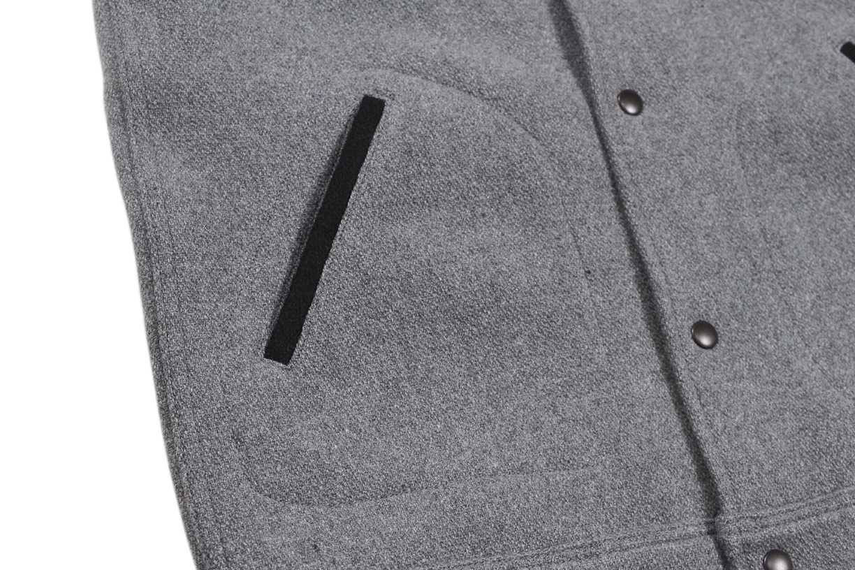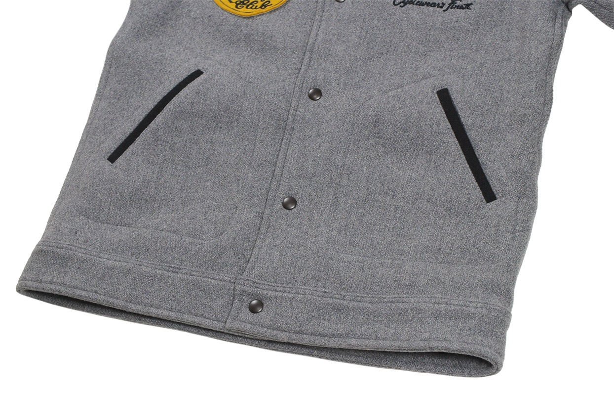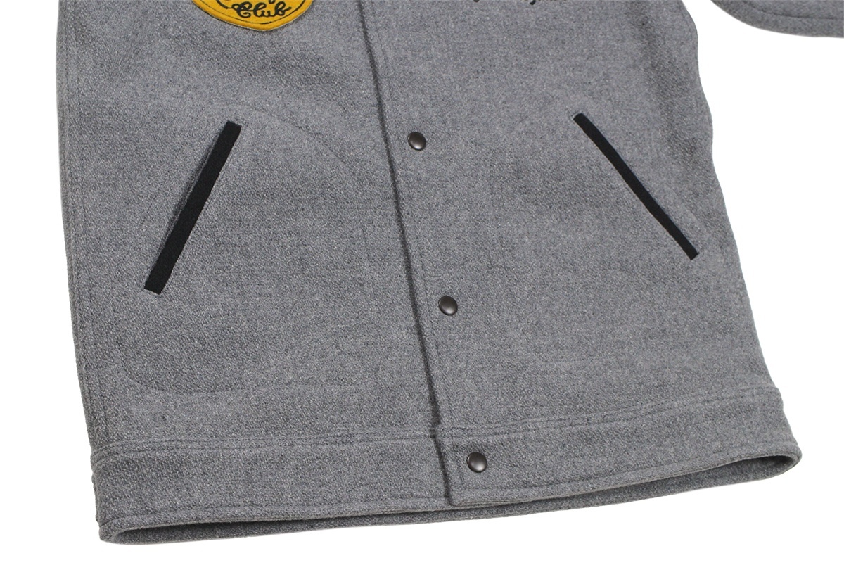 我々が憧れた原点、強大なアメリカの象徴でもあるFORT WORTH TEXASのクラシックスタイルなチームジャケットをイメージした会心の一着。W90N10のメルトンウールは羊の油分を取り除き、ヴィンテージさながらの表情を再現。襟と裾帯はリブを配せずにメルトン共地で仕上げた懐かしくも新鮮なスタイリングで。裏地には高密度モールスキン二重織組織に織り上げ、起毛加工を施した後、毛足を刈り込むことで肌触りの良い風合いが特徴。チェーン刺繍ワッペンと前後のチェーン刺繍は、新潟職人による手作業。袖口の丸リブはWOOL 100%の贅沢な仕様となります。