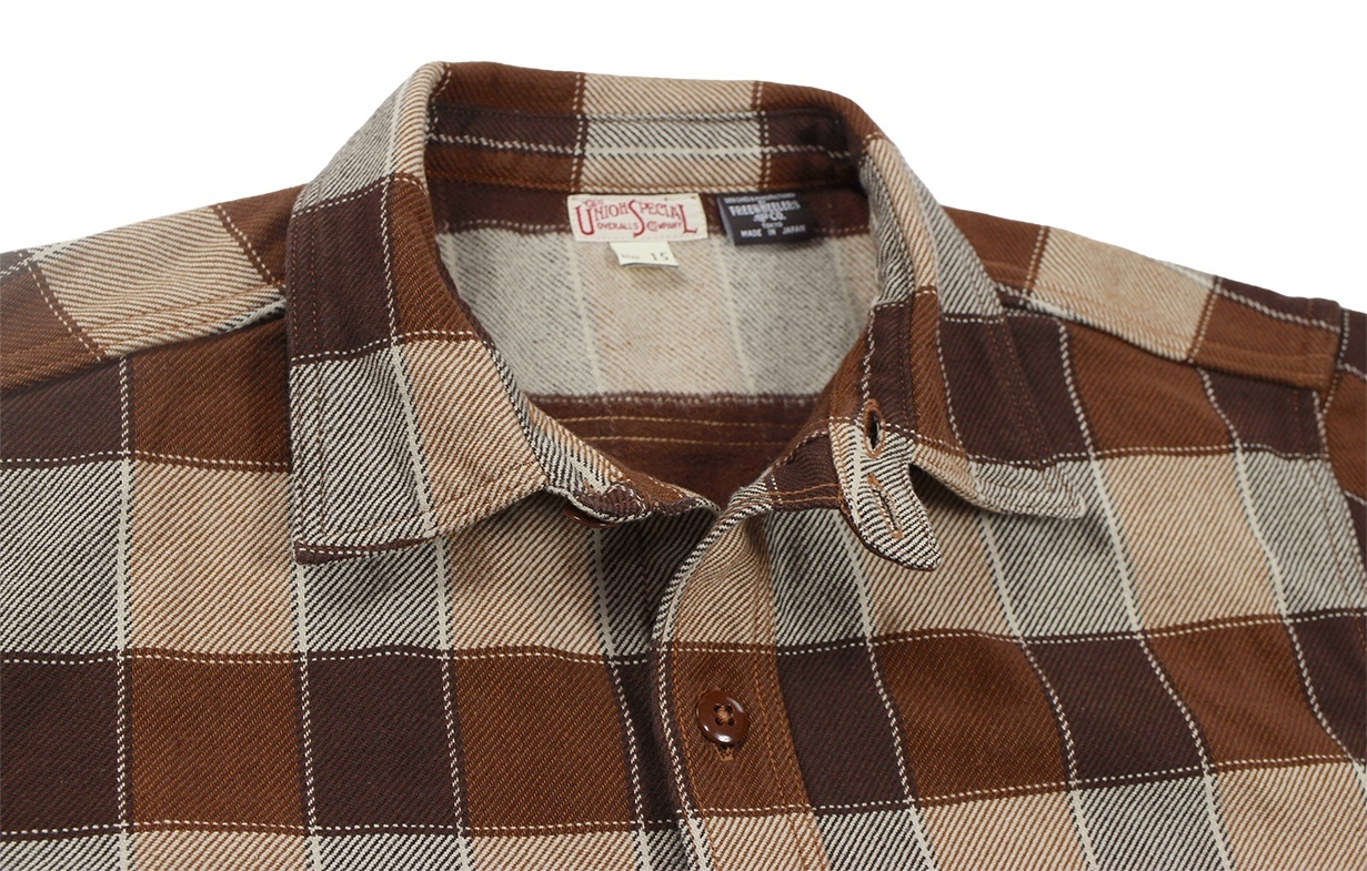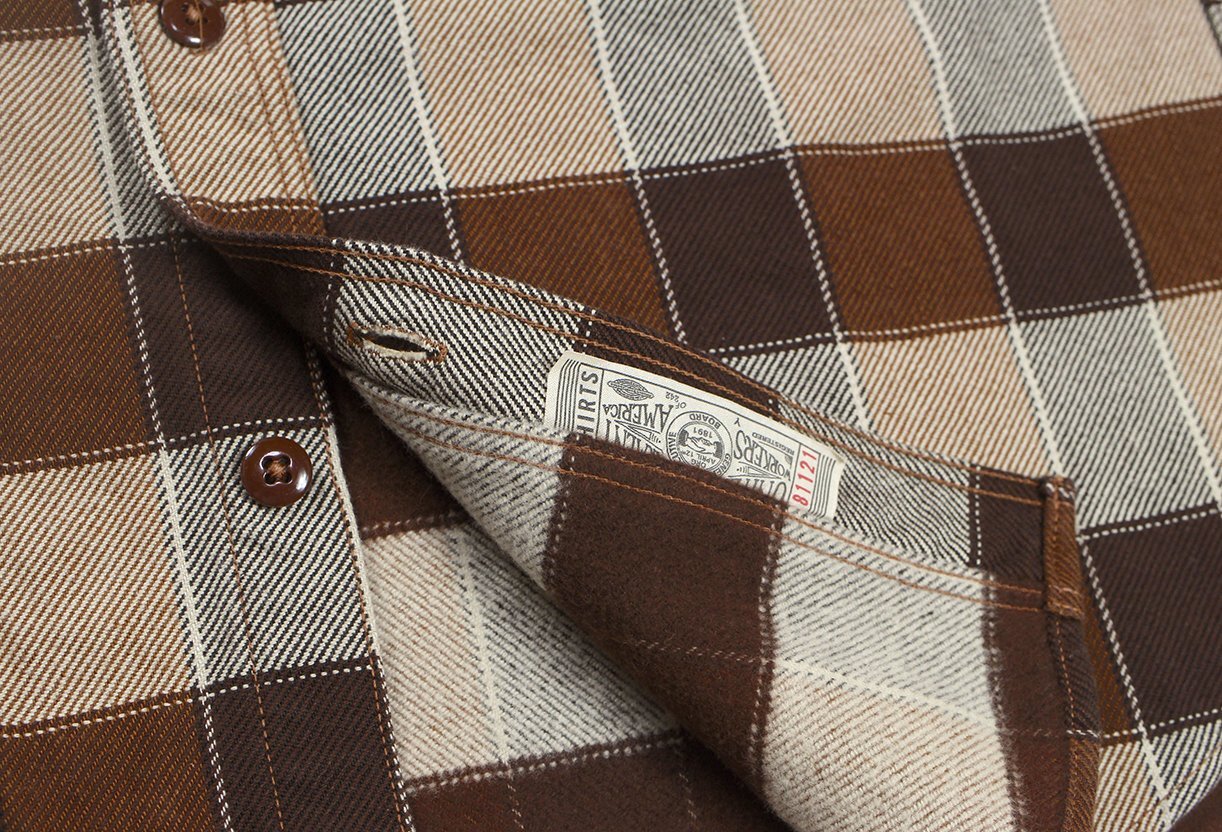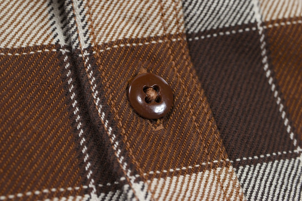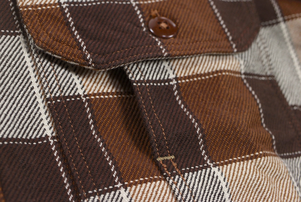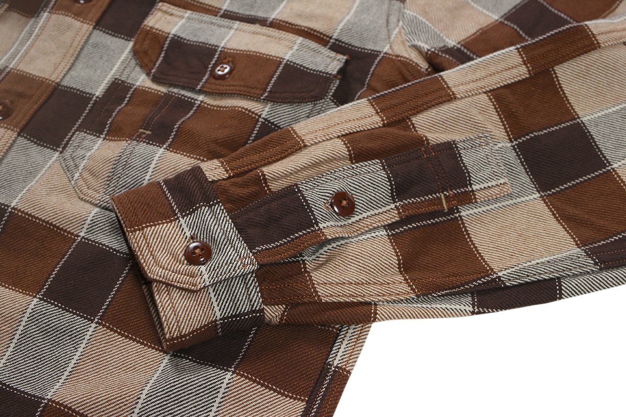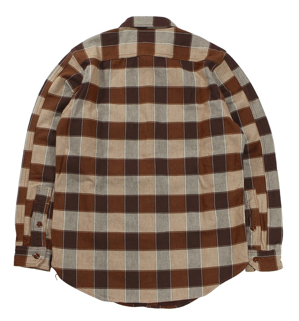 チェックパターンでありながらボーダー柄のようにも映る生地表情と、ブラウン×アイボリーの配色が魅力的なネルシャツになります。