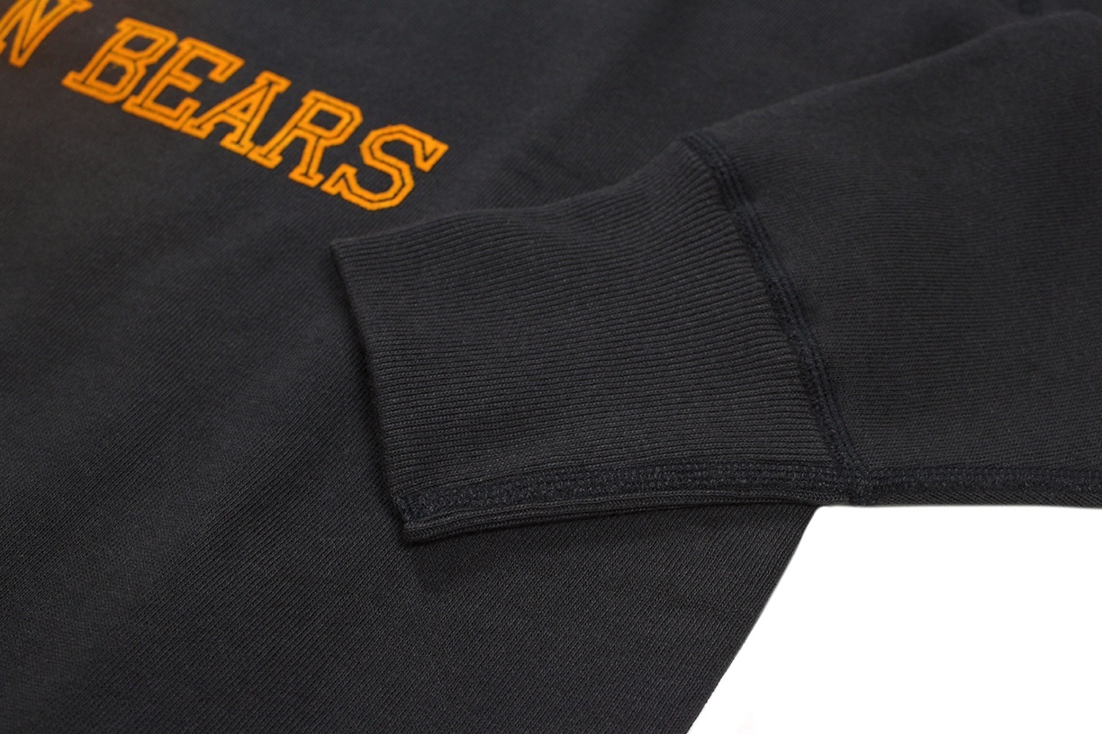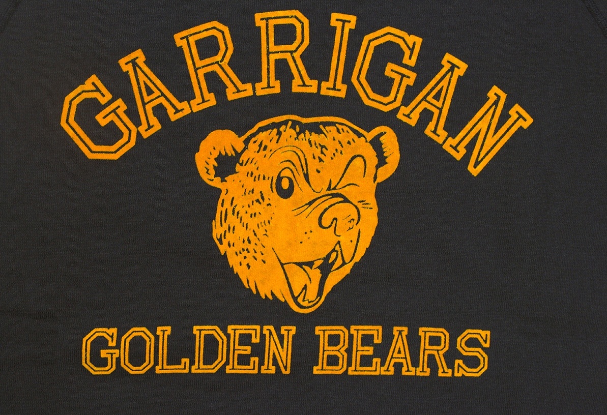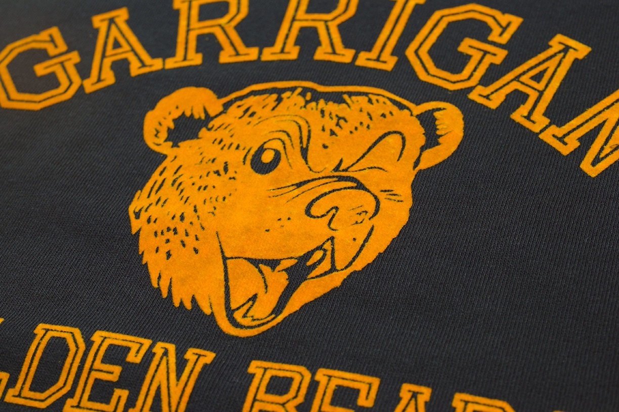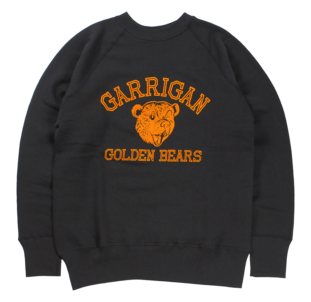 大学や高校が共有するスポーツチームのオリジナルキャラクターをフロッキーに着色してカラフルに描いたカラーフロッキーシリーズ。ウエアハウスとしては10数年ぶりの登場となります。ペナントやスウェットに施されたこれらのカラーフロッキーは、スポーツ観戦や応援など、属する学校や団体の団結のために製造されたものですが、それらは古着となり、年月を経て独特の毛羽立ちや擦れが出て、図柄がなんともいえない味わいに変化しているのが魅力です。ウエアハウスではラグランスウェットのボディーに、これらの新品の状態を再現し、着用と洗濯でヴィンテージのような褪色を楽しんでいただけるカラーフロッキースウェットを製作しました。