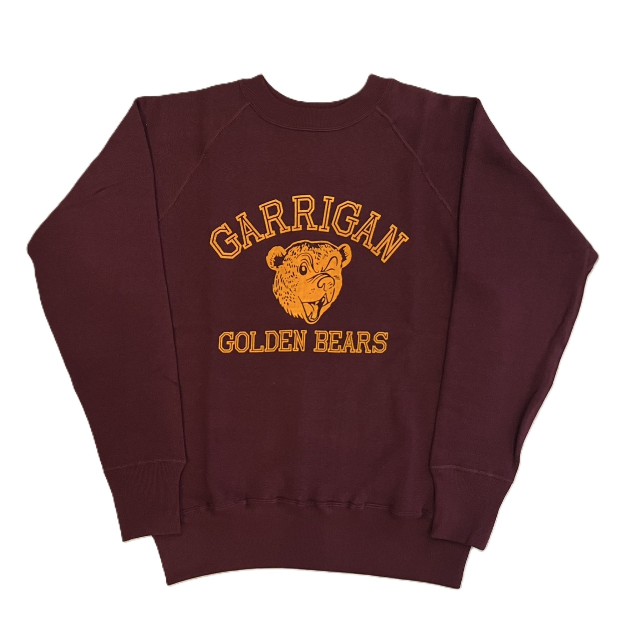 大学や高校が共有するスポーツチームのオリジナルキャラクターをフロッキーに着色してカラフルに描いたカラーフロッキーシリーズ。ウエアハウスとしては10数年ぶりの登場となります。ペナントやスウェットに施されたこれらのカラーフロッキーは、スポーツ観戦や応援など、属する学校や団体の団結のために製造されたものですが、それらは古着となり、年月を経て独特の毛羽立ちや擦れが出て、図柄がなんともいえない味わいに変化しているのが魅力です。ウエアハウスではラグランスウェットのボディーに、これらの新品の状態を再現し、着用と洗濯でヴィンテージのような褪色を楽しんでいただけるカラーフロッキースウェットを製作しました。