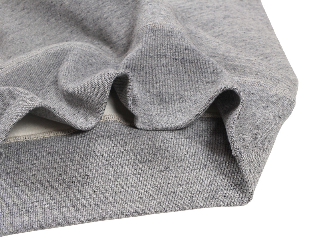 こちらは通常のMEDIUM WEIGHT素材と比べ1.4〜1.5倍の重量となり、表面はドライで固く粗野な質感を持ちながらも、裏面は毛足が長く深い起毛感を兼ね備えています。