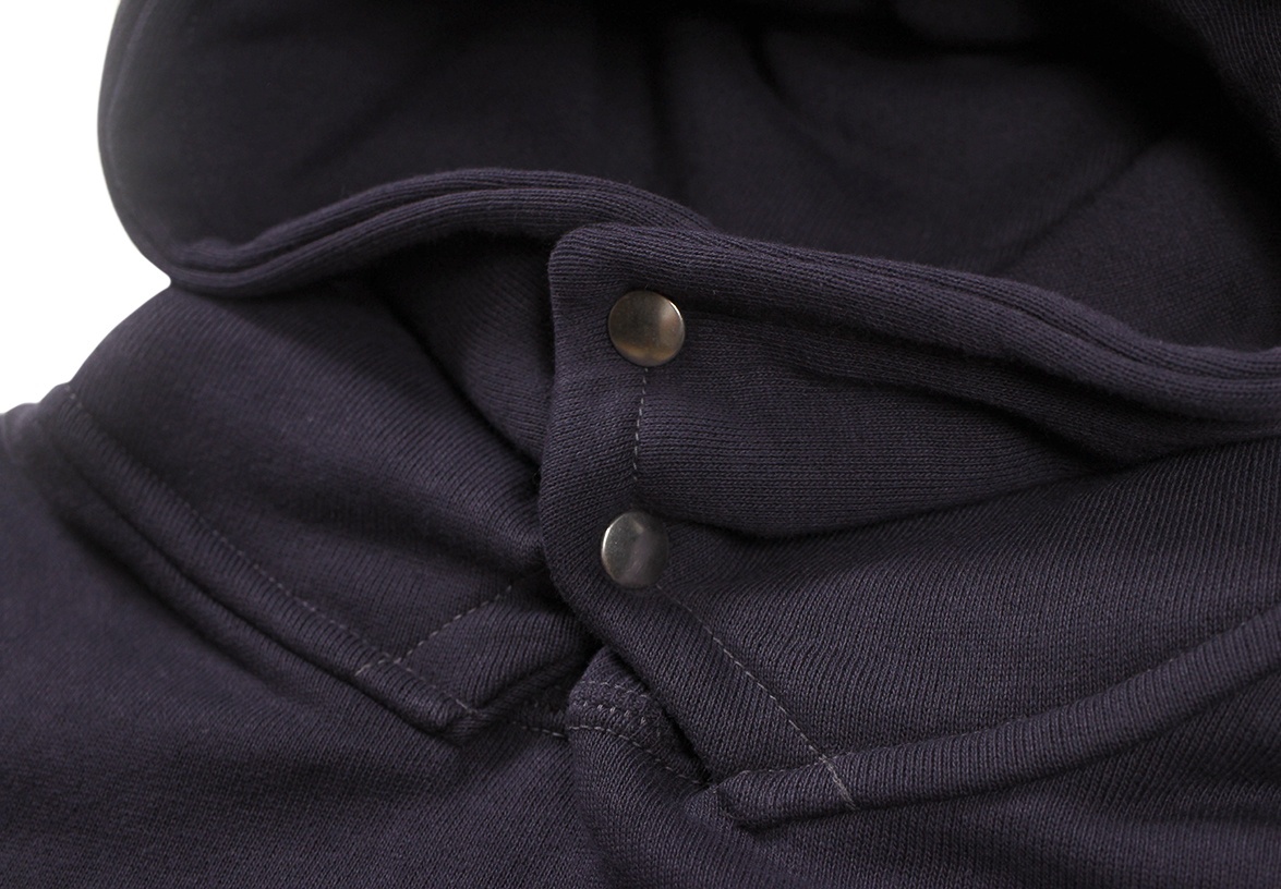 このモデルの多くは綿紐がついており、頭から被って紐を結ぶ仕様となっています。それよりも古い時代に作られたモデルには、このようにスナップボタンで留めるタイプが存在します。この仕様もウールの布帛であったフードを留めるための重厚な仕様の名残であり、コットン製のスウェットシャツとしては極めて珍しいディテールといえます。
