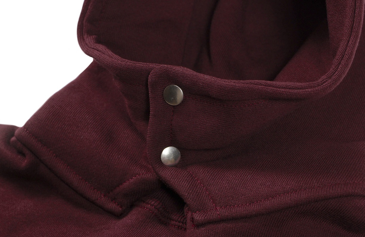 このモデルの多くは綿紐がついており、頭から被って紐を結ぶ仕様となっています。それよりも古い時代に作られたモデルには、このようにスナップボタンで留めるタイプが存在します。この仕様もウールの布帛であったフードを留めるための重厚な仕様の名残であり、コットン製のスウェットシャツとしては極めて珍しいディテールといえます。