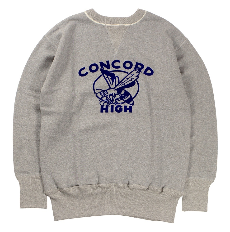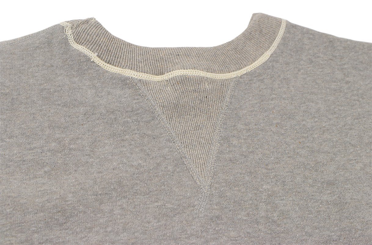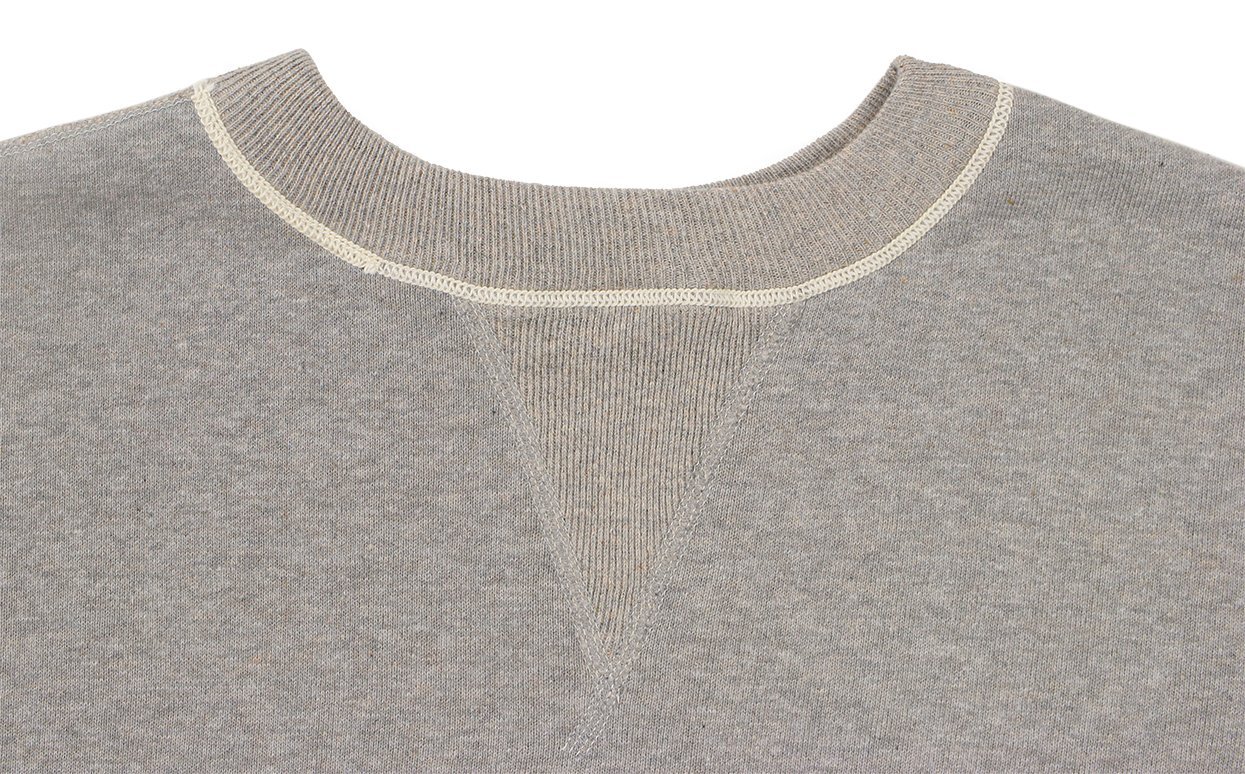 カットソーがウールからコットンに変わった1930年代からある挟み込み仕様の腰リブ。首まわりには伸縮に富むV字のフライスを前後に配した四本針仕様のスウェットです。肩口から垂直に落ちる袖口のセットインスリーブはややソリッドな印象を受けるシンプルなデザインですが、腰帯のバインダー仕様は着込むほどにアタリが生まれます。