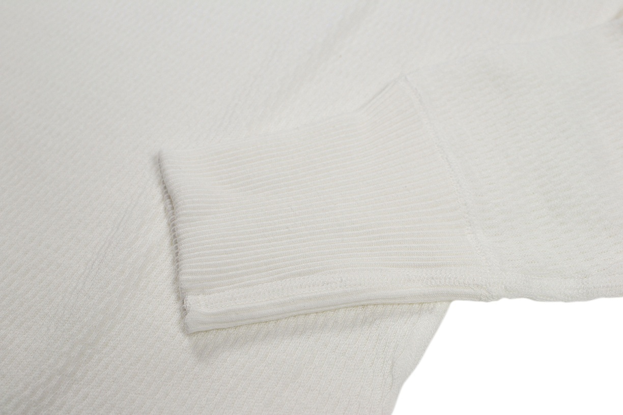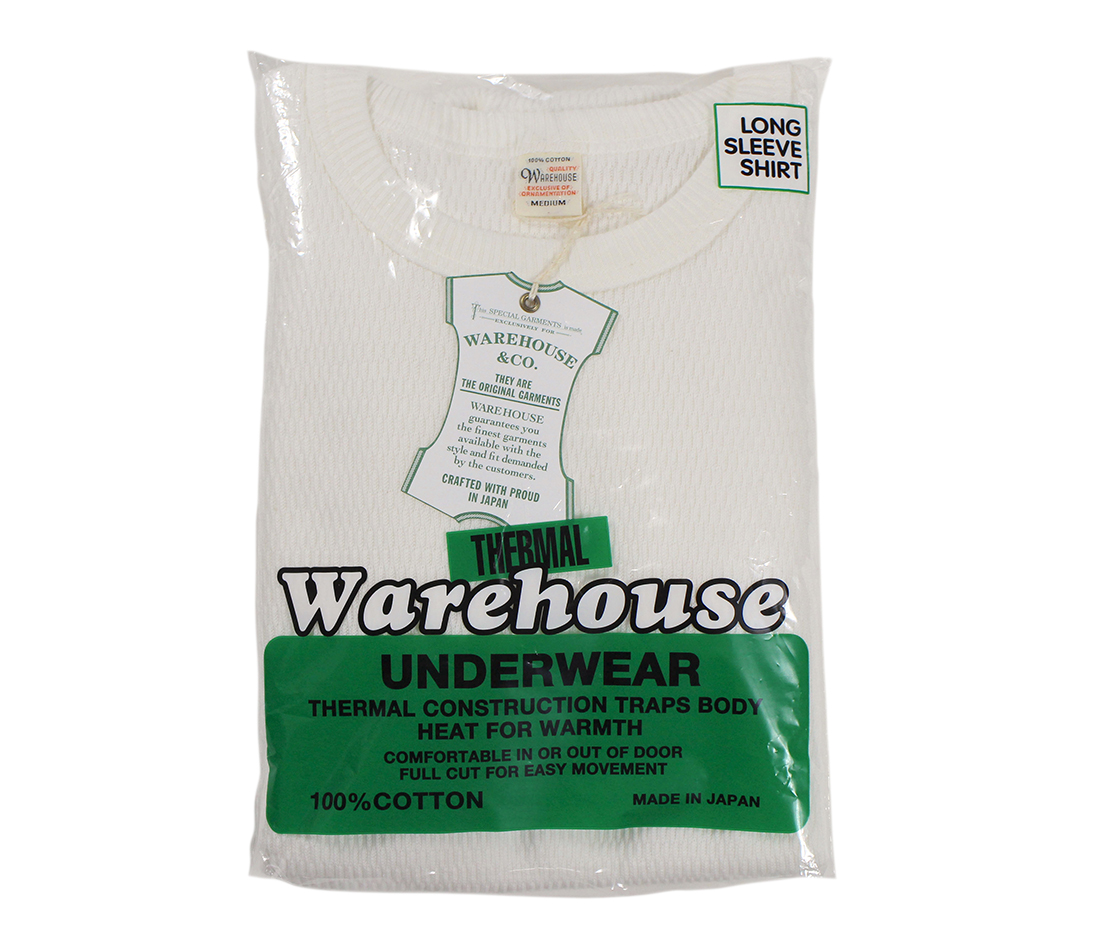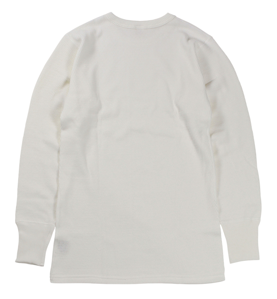 ウエアハウスのサーマルは’50年代頃の亀甲編みと呼ばれる仕様を再現しています。サーマル地の素材は、天竺や裏起毛よりも保温性と伸縮性に富み、よりタイトに身体にフィットします。洗うとよく縮みますが、着用することで適度に伸びが生まれ、洗濯でまたその分が縮みます。そのシンプルなサイクルを繰り返すことで、身体に馴染むデイリーウエアです。袖口のリブはやや長めに設定されているのも特徴のひとつ。
