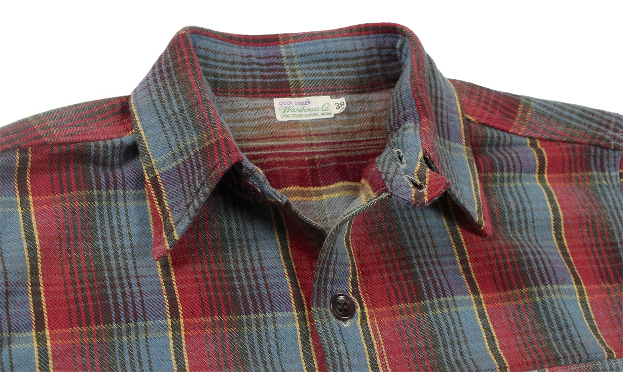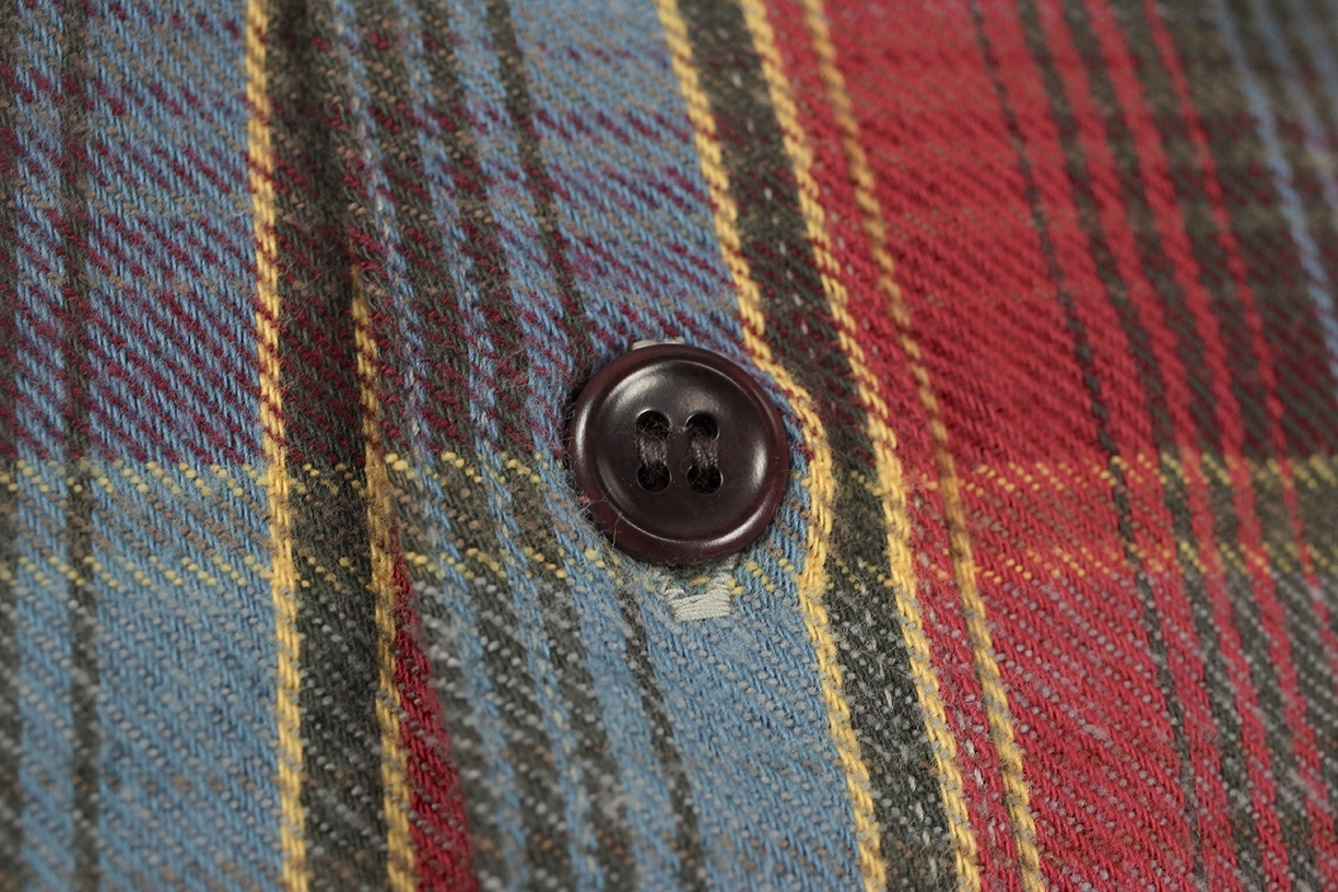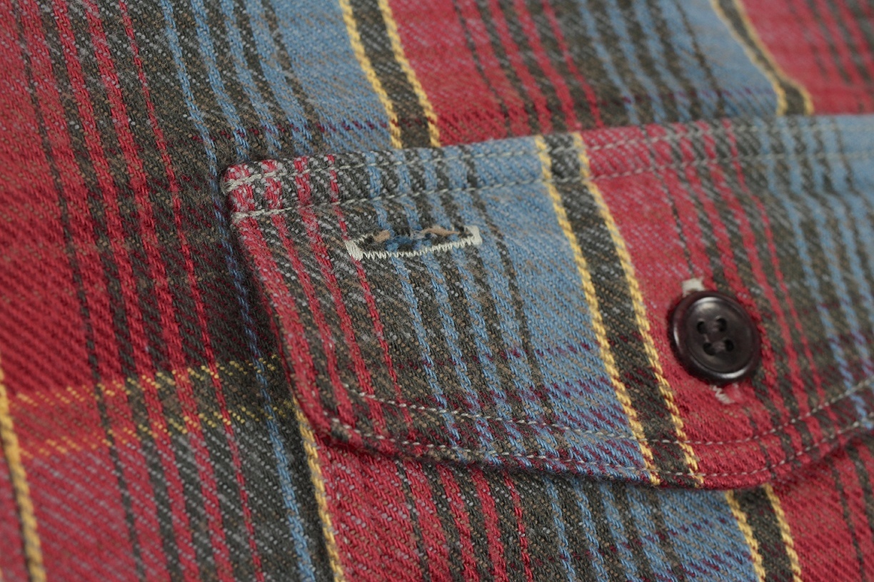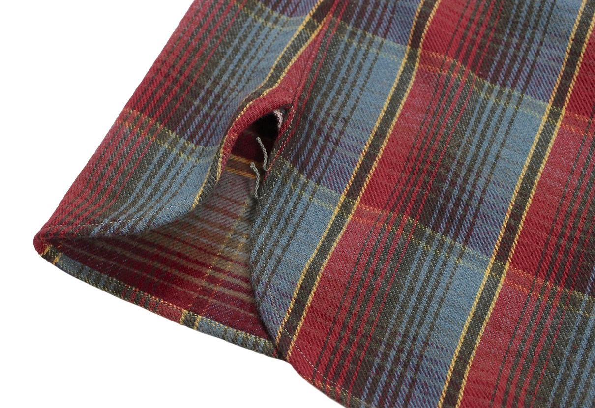 ウエアハウスのネルシャツは、生地に日本では限られた地域にしか残っていない力織機を使用して生地を作っています。フランネルの生地を作るために力織機を使う理由は単なる「耳付きのネル生地」を作りたいという理由からではありません、あくまでもセルビッチは副産物なのです。その目的は、力織機を使用することでムラ糸の持つ風合いを損なうことなく、生地に仕上げることができるからです。デニムと同じで、ヴィンテージネルシャツの生地を織っていた糸は不均一なムラ糸であった時代です。その糸を革新織機で強いテンションをかけて織ると違う生地になってしまう。せっかくの糸本来の性質が損なわれてしまうのです。旧式の力織機で織る事で、糸本来が持つ凹凸を損なうことなく生地を織ることが出来ます。ネルシャツを織る力織機はデニムと同じ綾織りの織機です。ネルシャツは柄を構成する必要があるため、多色の糸を織れる仕組みになっています。タテ糸は柄に合わせて複雑に上下移動し、その間を違う色のヨコ糸を持ったシャトルが次々に入れ替わり往復に移動します。こうして力織機らしい適度なテンションで織られたフランネルは、それぞれの糸本来が持っているムラを損なうことなく生地となるのです。生地になったネル生地は、当時の製法に倣って生地の裏に起毛加工を施しています。起毛をかけることで柄に柔らかい表情が生まれます。さらに起毛をかけることで生地に膨らみを生み、力織機ならではの肌触りをさらに柔らかなものに昇華させることができます。このように、力織機で織られたネルは、糸そのものから再現することでこそ生まれる風合いを持っています。それを見分ける最も簡潔な方法がセルビッチ(耳)の有無であり、1960年代頃までのヴィンテージネルシャツと同じように、ウエアハウスでもマチ部分にセルビッチを使用しているのです。