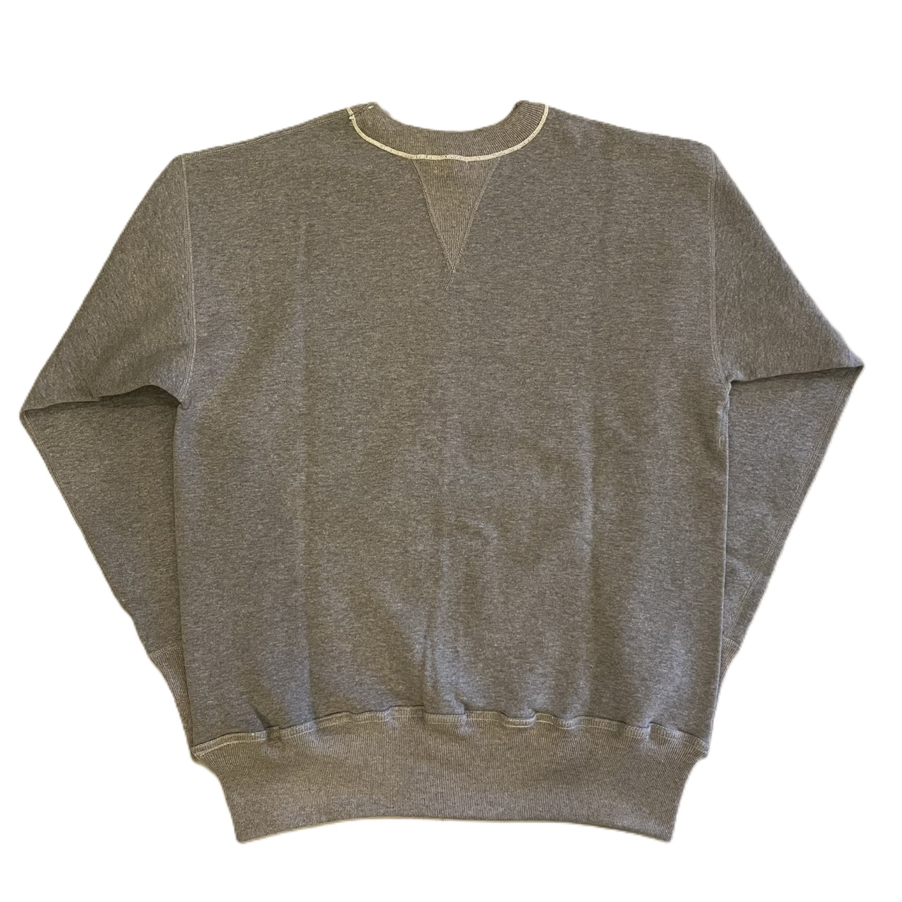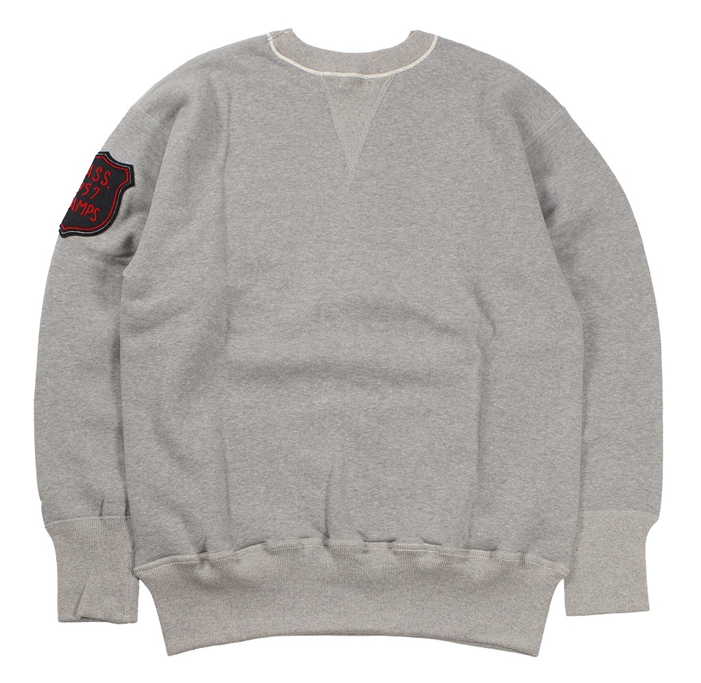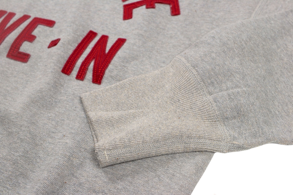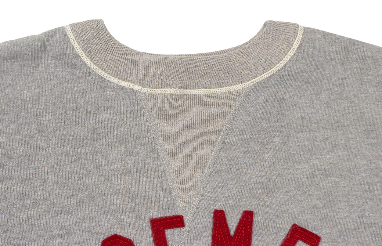 カットソーがウールからコットンに変わった1930年代からある挟み込み仕様の腰リブ。首まわりには伸縮に富むV字のフライスを前後に配した四本針仕様のスウェットです。肩口から垂直に落ちる袖口のセットインスリーブはややソリッドな印象を受けるシンプルなデザインですが、腰帯のバインダー仕様は着込むほどにアタリが生まれます。
