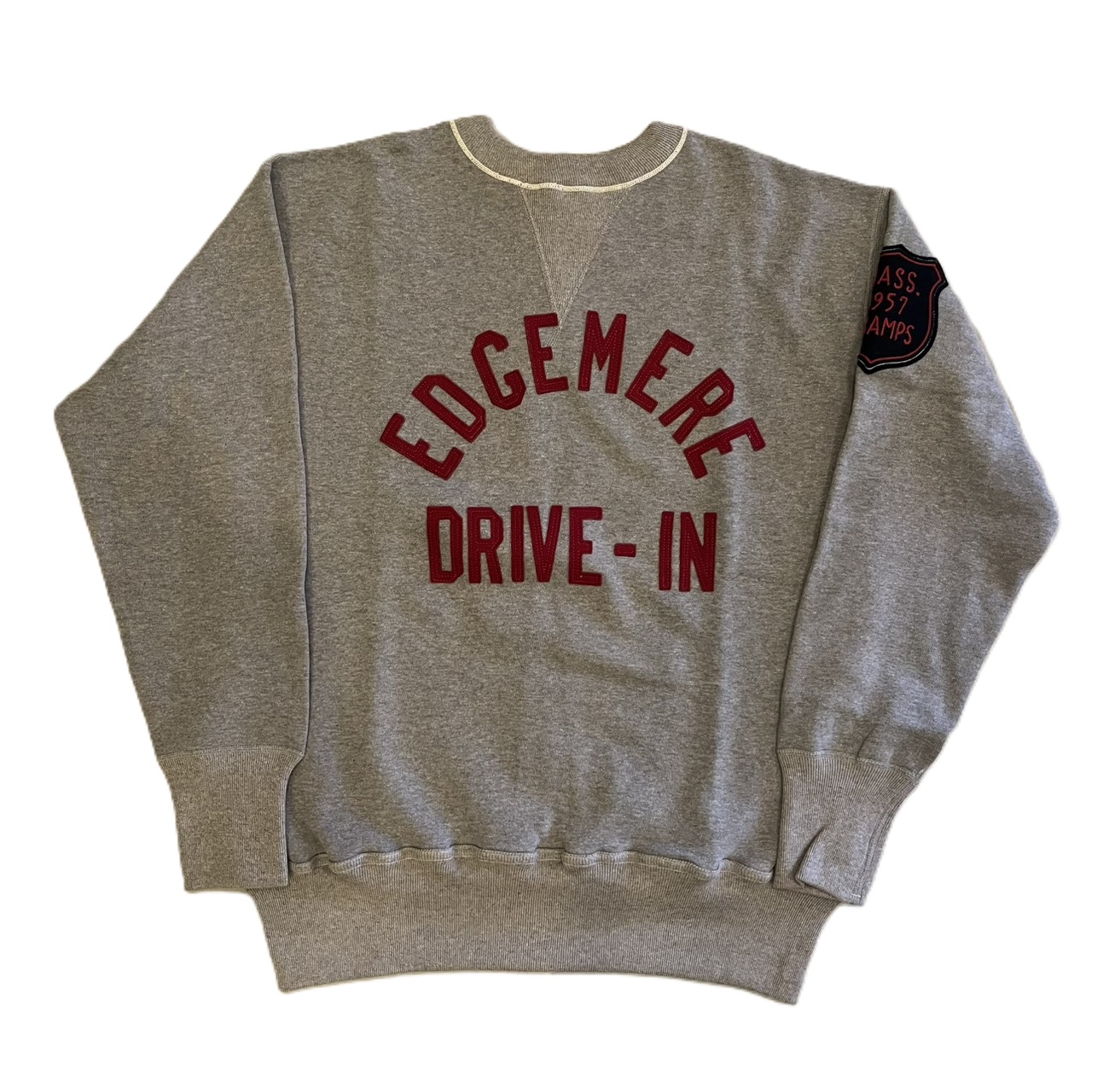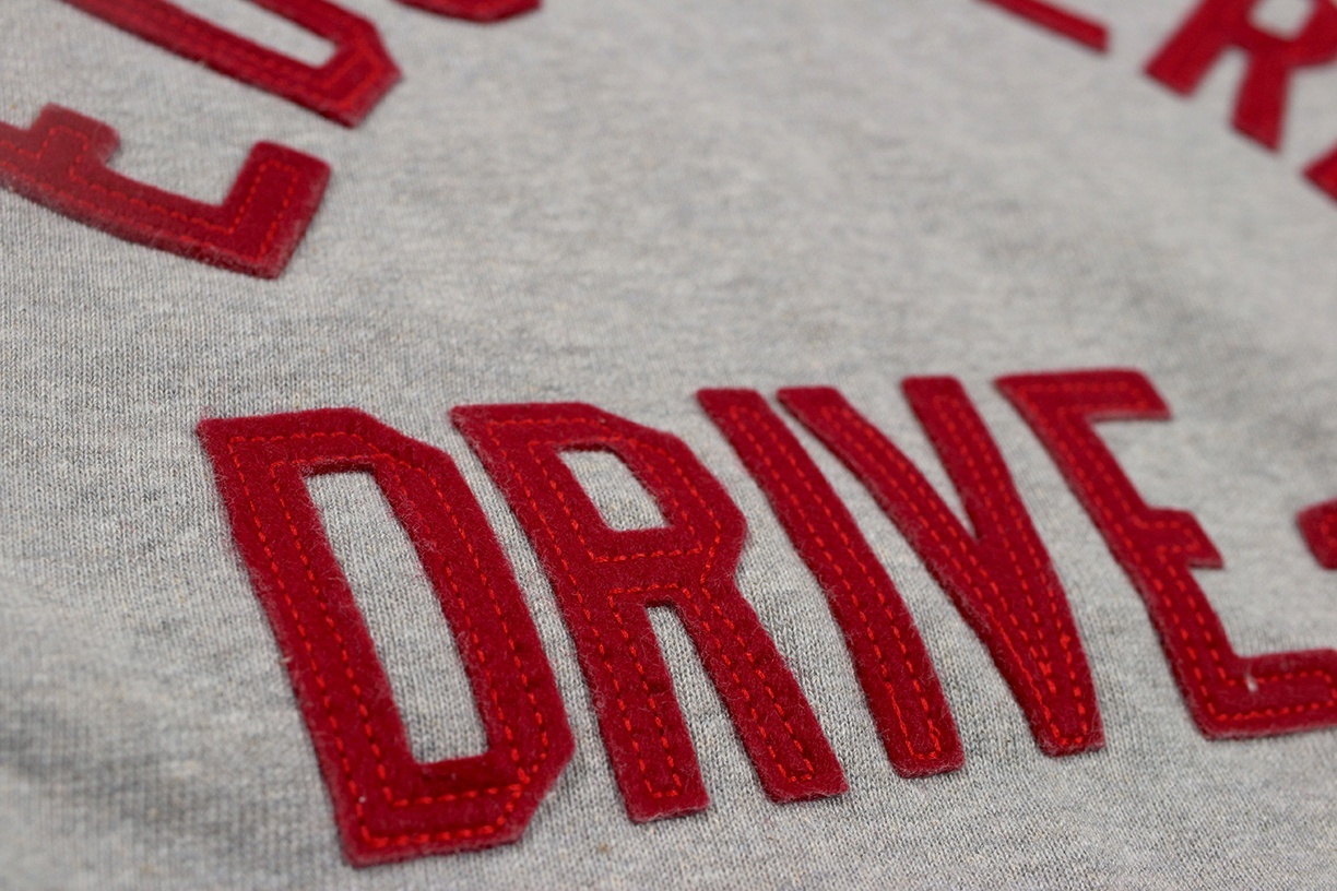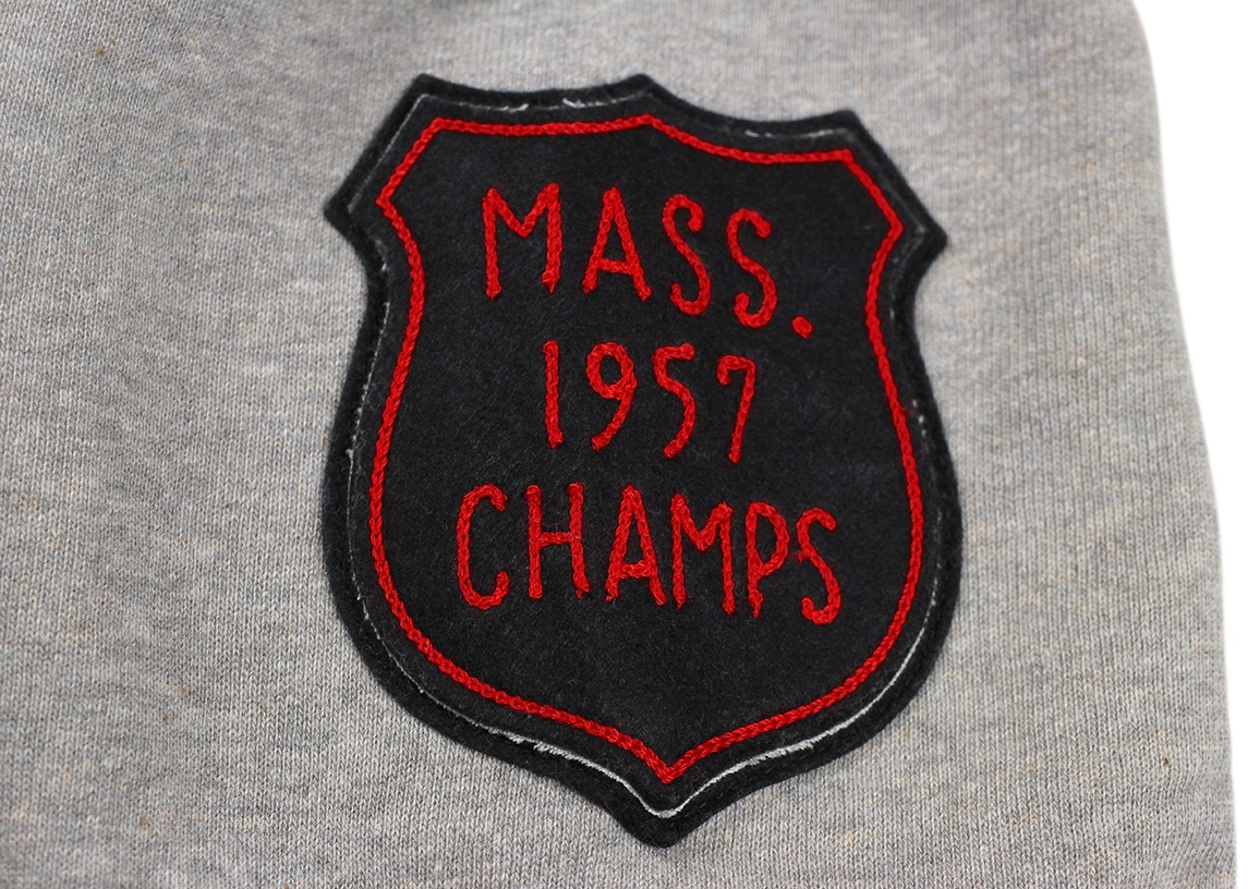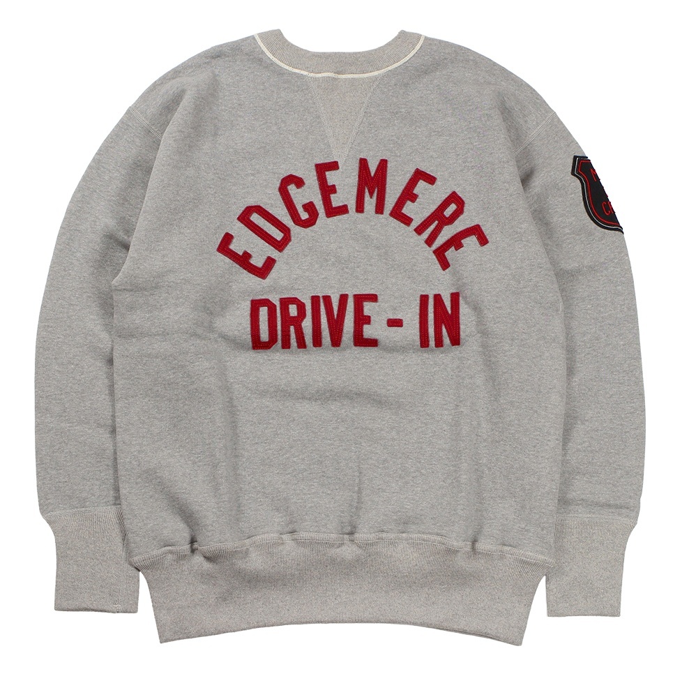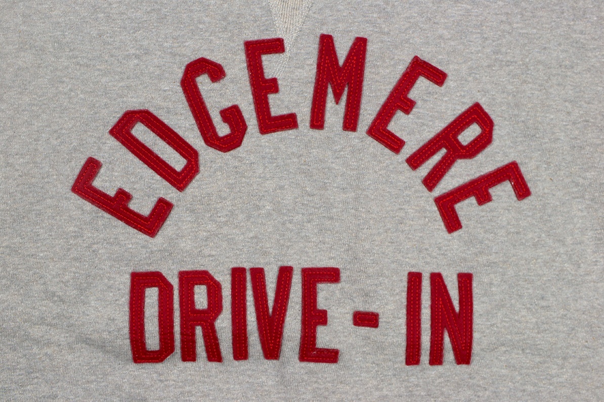 カットソーがウールからコットンに変わった1930年代からある挟み込み仕様の腰リブ。首まわりには伸縮に富むV字のフライスを前後に配した四本針仕様のスウェットです。肩口から垂直に落ちる袖口のセットインスリーブはややソリッドな印象を受けるシンプルなデザインですが、腰帯のバインダー仕様は着込むほどにアタリが生まれます。