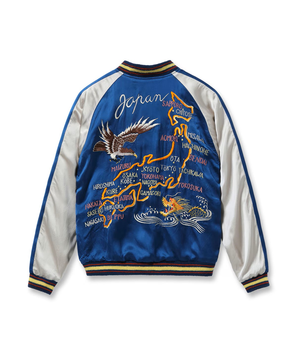 対してリバーシブル面はジャパンマップ柄。海を想わせる鮮やかなブルーのサテン生地に、日本地図を挟んで鷲と龍が睨み合う構図となっている。本作は数あるヴィンテージスカジャンの絵柄の中でも特にジャパンマップが大きく、上部のスペースが限られるため「Japan」の位置も中央ではなく北海道の横に。さらに地名の数も非常に多く、主要都市や米軍にまつわる地名を所狭しと描いている。このように贅沢な刺繍のジャパンマップ柄は他に類を見ず、港商スペシャルエディションの名にふさわしい一着と言えるだろう。