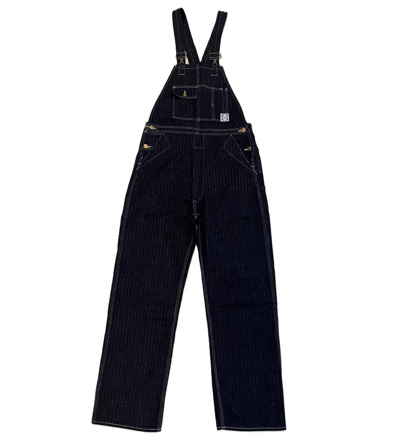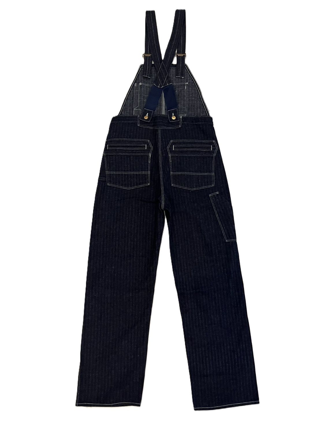 また、オーバーオールのリアポケットには、ジャケットでは何度か見たことがあるが、パンツやオーバーオールでは見たことのない補強が施されています。 こうして出来上がったのが「シャドーストライプ」のインディゴ・デニムを使ったストロングアーム・レインフォースド・オーバーオールなのです。」