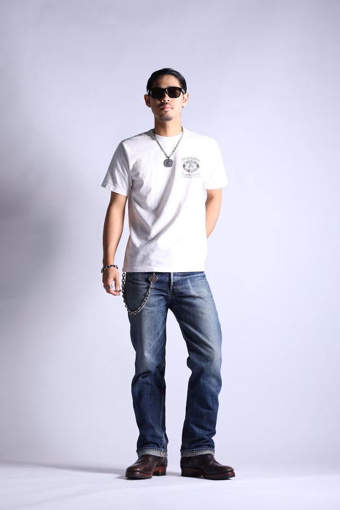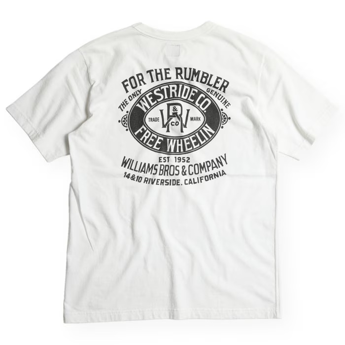 旧くは「4輪の馬車=音を立てて前に進むもの」を意味するRUMBLERSのワード。そんな人々の為の当時の衣料メーカーの旧き良きアドバタイズ風イメージでまとめ上げた、PSYCHO氏描き下ろしとなる今季の新作メイングラフィック。WILLIAMS BROSの名前でシーズンテーマに繋がる「JAMBALAYA」のカントリー・シンガーと、自由への「解放」を表現するシンプルながら威風堂々とした存在感とストーリー性が溢れる今季のメインTEE。