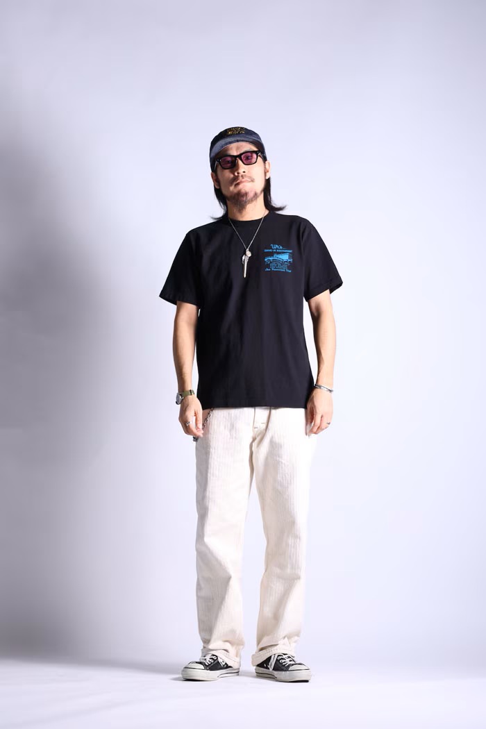 縫製:WESTRIDEのオリジナルTEEは、丸胴の吊り機で編み立てる→サイドを割ってダブルシームで縫製→内側サイドの縫い代をカット→ネックはトリプルバインダー。と非常に手間のかかる仕上げとなっている。この工程により、丸胴に見られるヨジレなどの型崩れもなく、肌触りも良好となる。肌着としての側面も持つTEEだけに、プリント柄だけでなく、品質そのものに拘って生産しています。