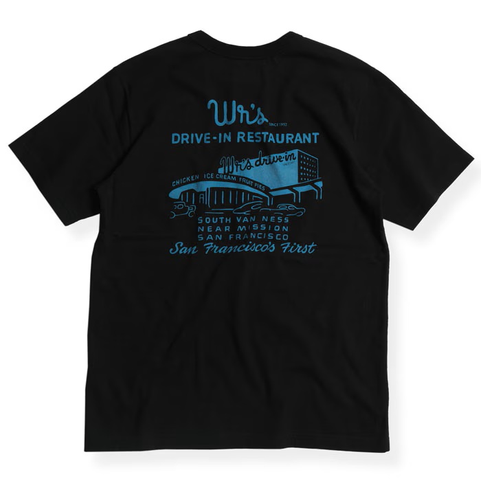 戦後の混乱を乗り越えて既に、文化と経済の黄金期へ向かう50年代のアメリカ。当時のヒストリック・ロードのランドマークであったであろうDRIVE-INのスーベニア(お土産)TEEのイメージで描いた雰囲気抜群の一枚。当時の空気感と息吹まで伝わるかのようだ。
