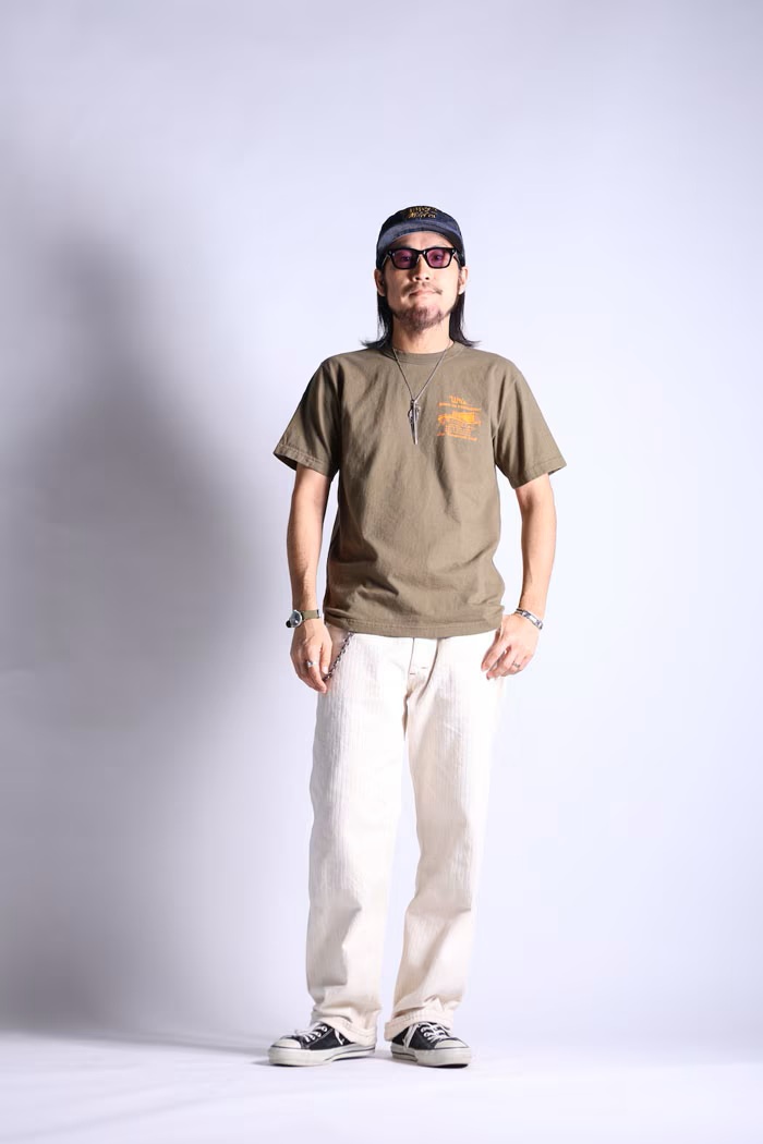 プリント手法:プリント手法に関しては、同一デザインであっても、ベースカラーやプリントカラー、プリントデザインを一つ一つ勘案し、各々ベストなものをチョイスし手刷りで行っている。(水性染込み、半ラバー、抜染、ひび割れなど)。