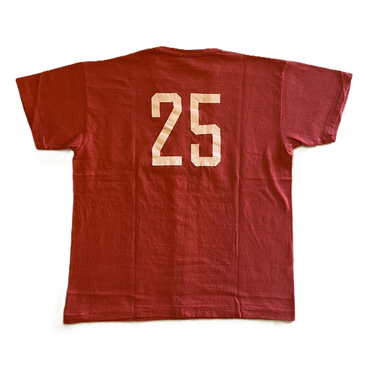 適度に緩んだネックライン、ボディのフェード感や、プリントの褪色、掠れ、起毛感など、何年も着こまれ、洗いこまれた古着のTシャツをイメージして製作しています。
